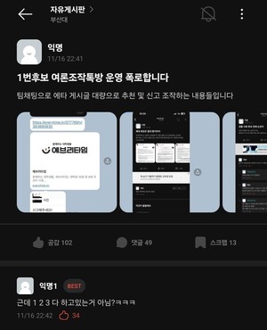 우리 대학 총학생회 선거에 출마한 후보 측이 온라인 여론에 조직적으로 개입했다는 의혹이 제기돼 논란이 일고 있다.17일 취재를 종합하면 우리 대학 익명 온라인 커뮤니티 에브리타임(에타)에는 '1번 후보 여론 조작 톡방 운영 폭로합니다'라는 제목의 게시글과 단체 채팅방 대화 내역을 캡쳐한 17장의 이미지가 게재됐다. 취재진이 입수한 캡쳐본에 따르면 기호 1번 선거운동본부(선본) PASS의 부후보로 보이는 인물의 대화 내역이 포함됐다.해당 채팅방에서는 일부 구성원이 에타 게시물 링크를 공유하고, PASS 선본에 부정적일