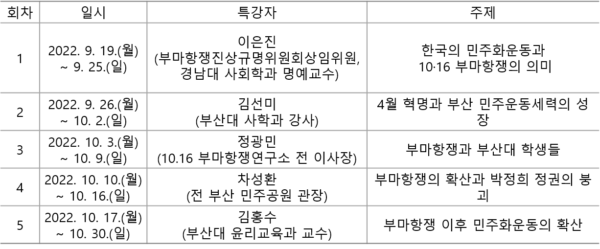 자세한 사항은 교양교육원 홈페이지(공지사항 - 「대학과 민주: 우리 선배들의 자랑스러운 역사 부마민주항쟁」 특강 안내 (pusan.ac.kr))를 참고하면 된다.