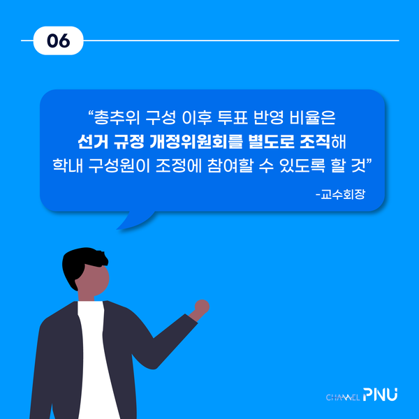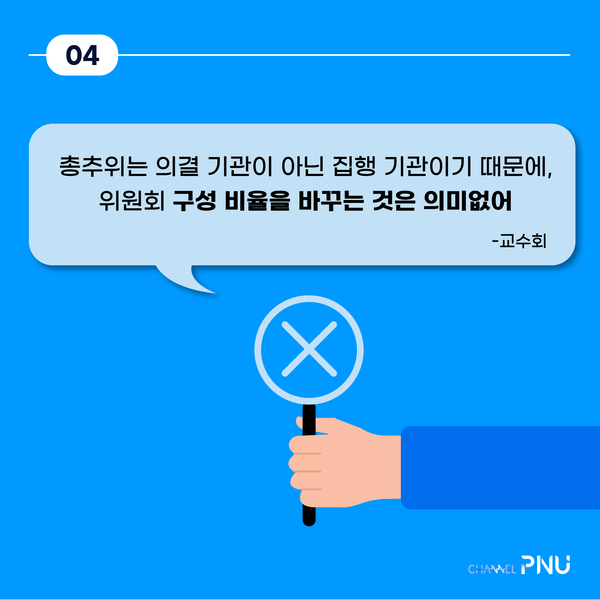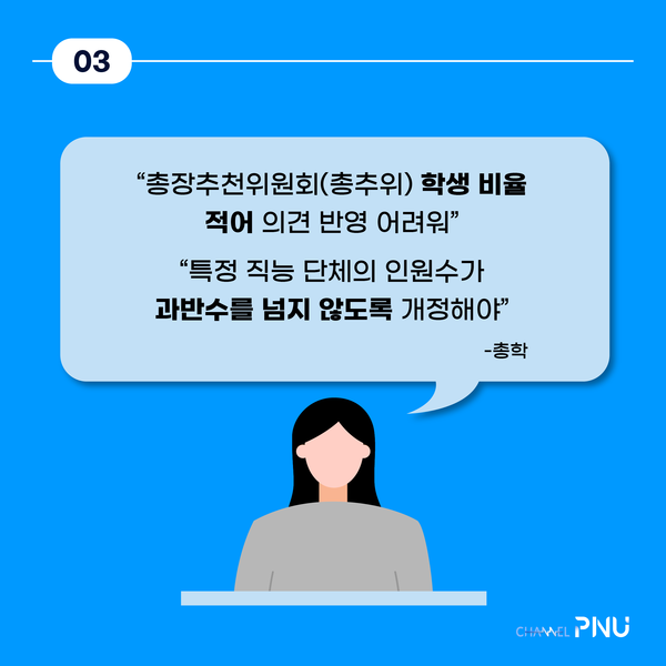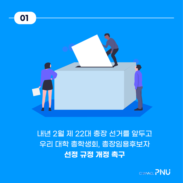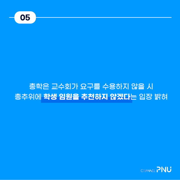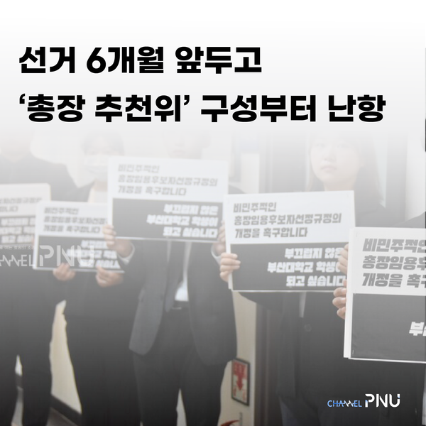 유익해요0공유하고 싶어요0좋아요0화나요0후속기사 원해요0 관련기사 선거 6개월 앞두고 ‘총장 추천위’ 구성부터 난항 김윤영 kyy091009@naver.com 다른기사 보기 저작권자 © 채널PNU 무단전재 및 재배포 금지 당신만 안 본 뉴스 [2026 학생회] 투표 전 필독, 총학 세 후보가 말하는 비전 총학 선본 '온라인 여론 개입' 의혹에 선관위 조사 [2026 학생회] 단과대·동연 후보들 한눈에 보기 [특집] 채널PNU 주최 '총학 후보자와의 만남' 풀영상·전문 공개 총학 선관위원장, 공정성 훼손 논란으로 해임 총학 후보 토론회, 현안 논했지만 구체성은 '글쎄' 부산대 야간 무인 편의점, 화재엔 '무방비' [2026 학생회] 투표 전 필독, 총학 세 후보가 말하는 비전 개의 댓글 회원로그인 작성자 비밀번호 댓글 내용입력 댓글 정렬 최신순 추천순 답글순 BEST댓글 BEST 댓글 답글과 추천수를 합산하여 자동으로 노출됩니다. 닫기 더보기 댓글삭제 삭제한 댓글은 다시 복구할 수 없습니다. 그래도 삭제하시겠습니까? 비밀번호 닫기 댓글수정 댓글 수정은 작성 후 1분내에만 가능합니다. 본문 / 400 비밀번호 닫기 내 댓글 모음 닫기 주요기사 11월 4주 효원알리미 Beyond Borders, Within Growth: PNU Students Share Their Global Stories 총학 후보 토론회, 현안 논했지만 구체성은 '글쎄' Three Candidates Face Off in PNU GSA Election After Nine Years 총학 선관위원장, 공정성 훼손 논란으로 해임 Vacant Houses Reborn as Community Hubs in Busan