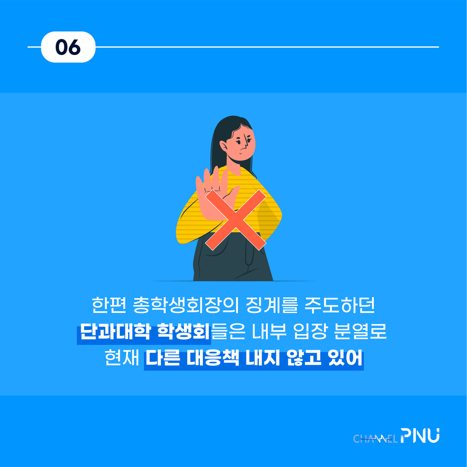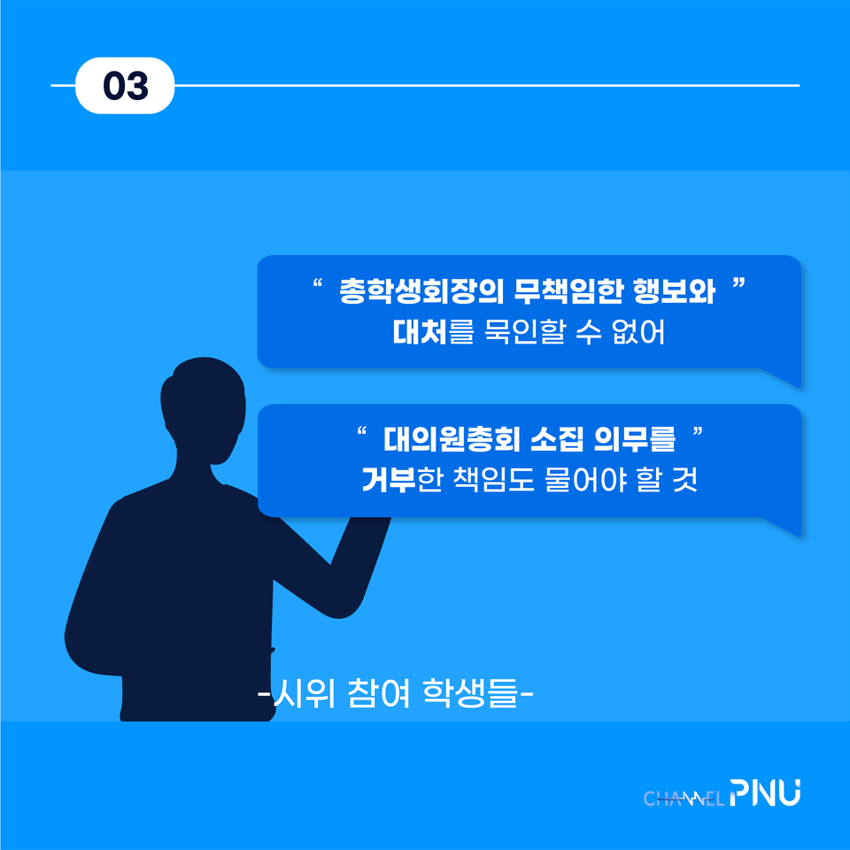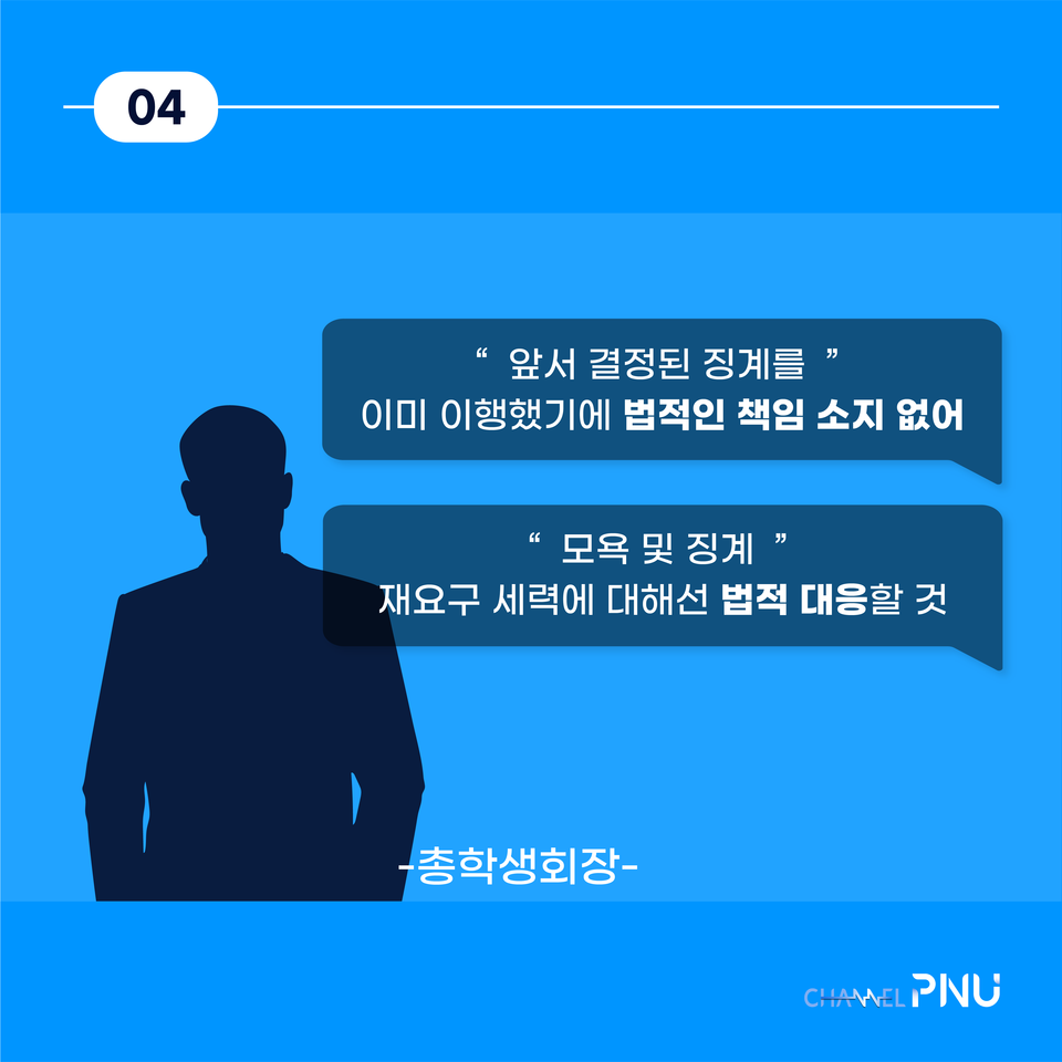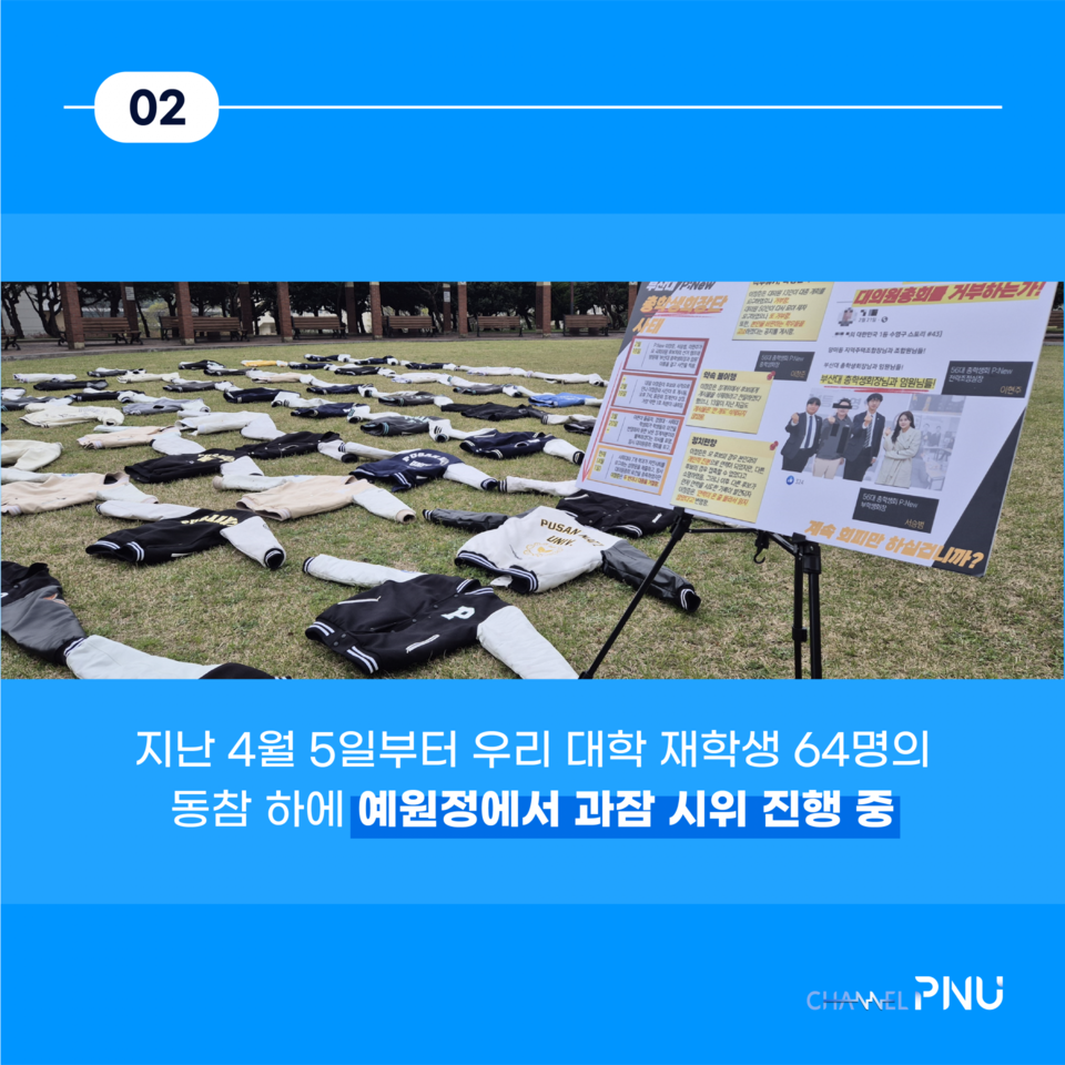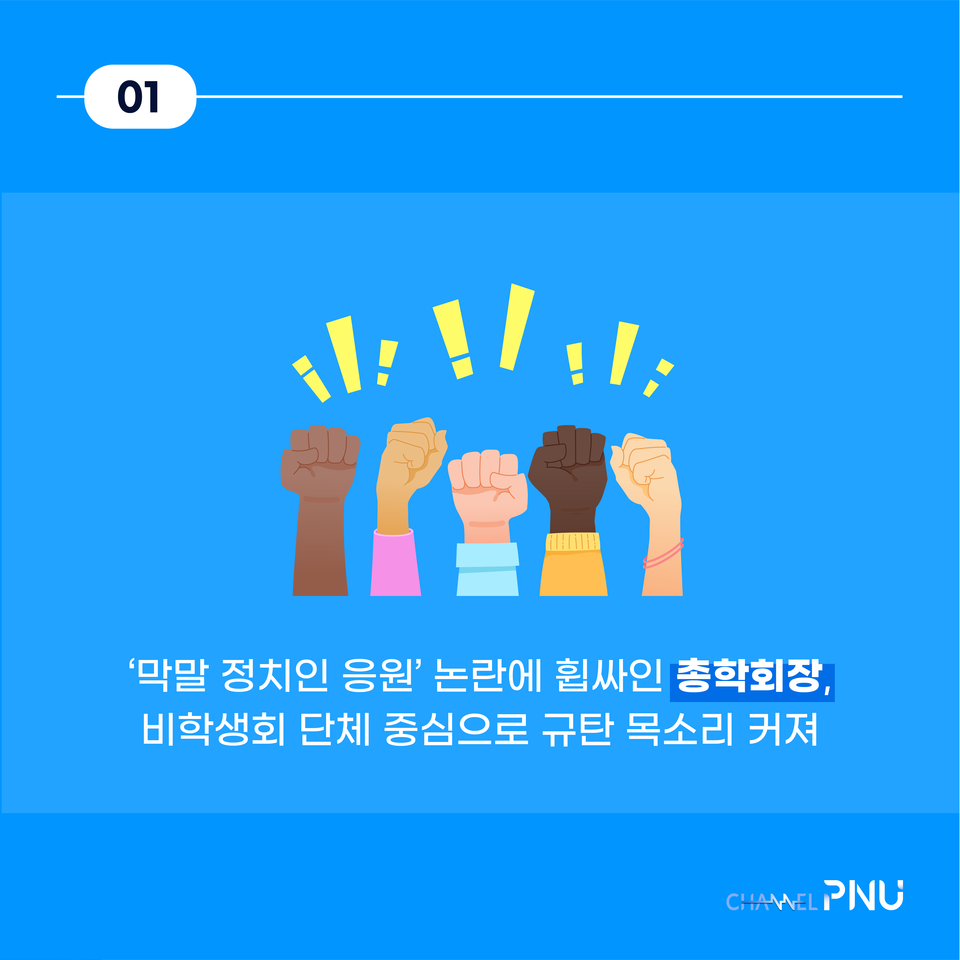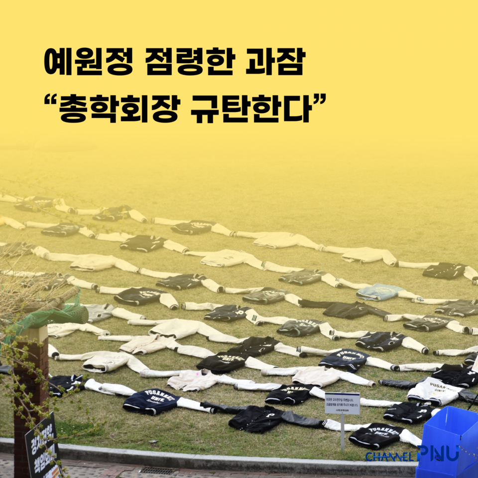 유익해요0공유하고 싶어요0좋아요0화나요0후속기사 원해요0 관련기사 예원정 점령한 과잠 "총학회장 규탄한다" 김채현 기자 banano8877@naver.com 다른기사 보기 저작권자 © 채널PNU 무단전재 및 재배포 금지 당신만 안 본 뉴스 [2026 학생회] 투표 전 필독, 총학 세 후보가 말하는 비전 총학 선본 '온라인 여론 개입' 의혹에 선관위 조사 [2026 학생회] 단과대·동연 후보들 한눈에 보기 [특집] 채널PNU 주최 '총학 후보자와의 만남' 풀영상·전문 공개 총학 선관위원장, 공정성 훼손 논란으로 해임 총학 후보 토론회, 현안 논했지만 구체성은 '글쎄' 부산대 야간 무인 편의점, 화재엔 '무방비' [2026 학생회] 투표 전 필독, 총학 세 후보가 말하는 비전 개의 댓글 회원로그인 작성자 비밀번호 댓글 내용입력 댓글 정렬 최신순 추천순 답글순 BEST댓글 BEST 댓글 답글과 추천수를 합산하여 자동으로 노출됩니다. 닫기 더보기 댓글삭제 삭제한 댓글은 다시 복구할 수 없습니다. 그래도 삭제하시겠습니까? 비밀번호 닫기 댓글수정 댓글 수정은 작성 후 1분내에만 가능합니다. 본문 / 400 비밀번호 닫기 내 댓글 모음 닫기 주요기사 11월 4주 효원알리미 Beyond Borders, Within Growth: PNU Students Share Their Global Stories 총학 후보 토론회, 현안 논했지만 구체성은 '글쎄' Three Candidates Face Off in PNU GSA Election After Nine Years 총학 선관위원장, 공정성 훼손 논란으로 해임 Vacant Houses Reborn as Community Hubs in Busan