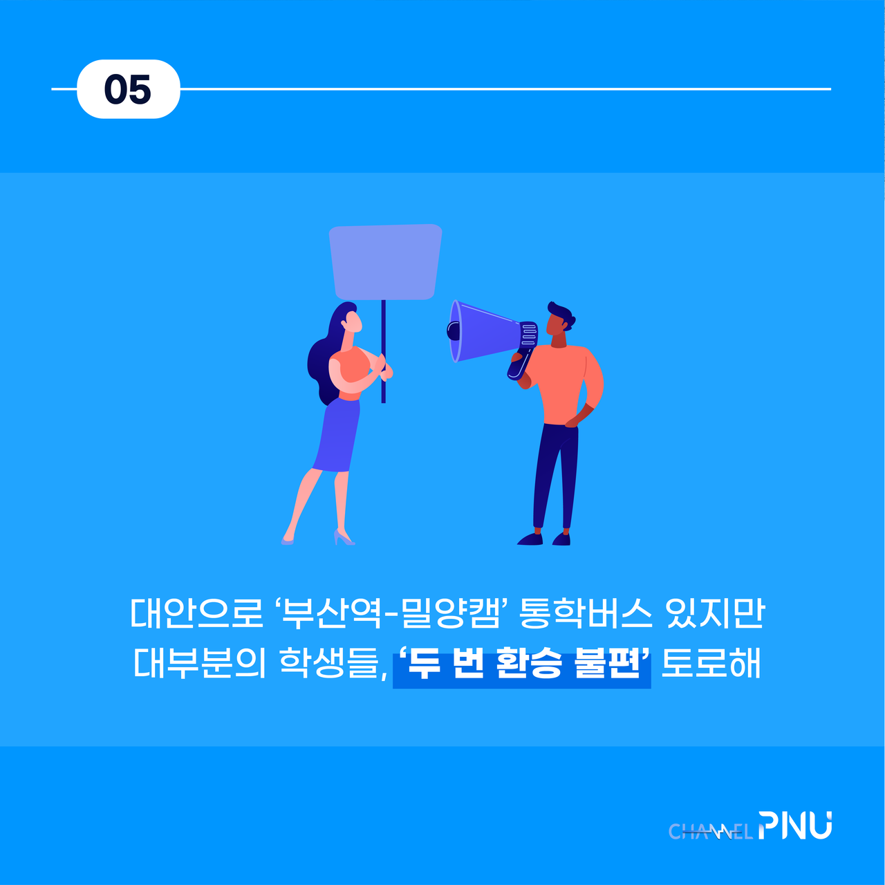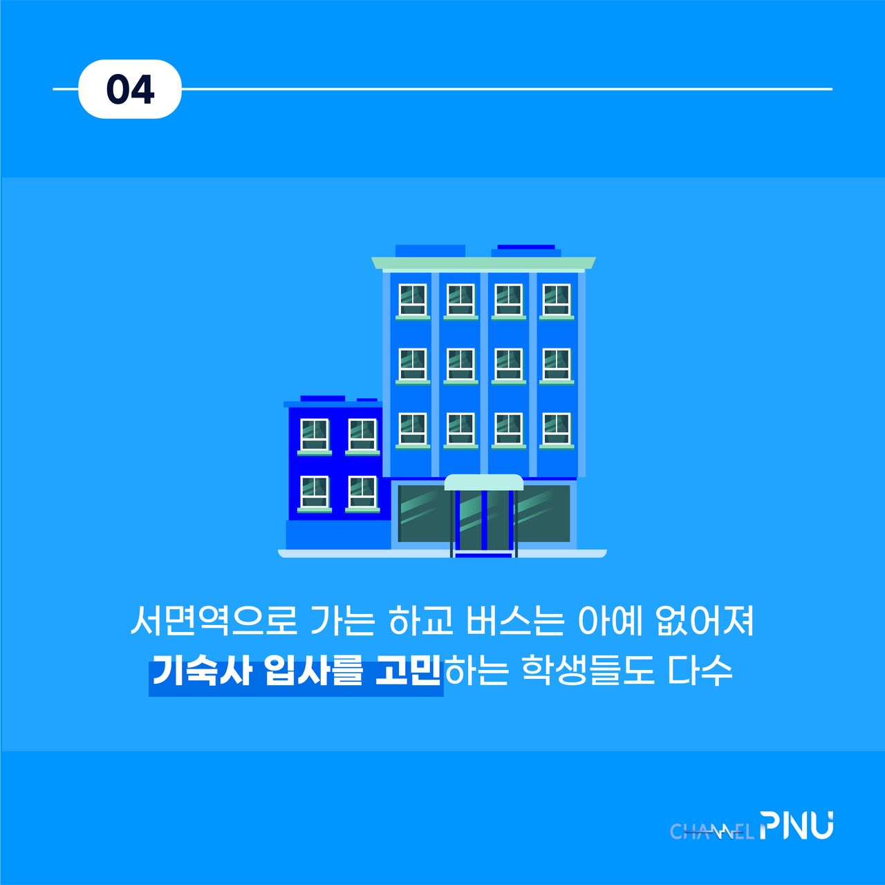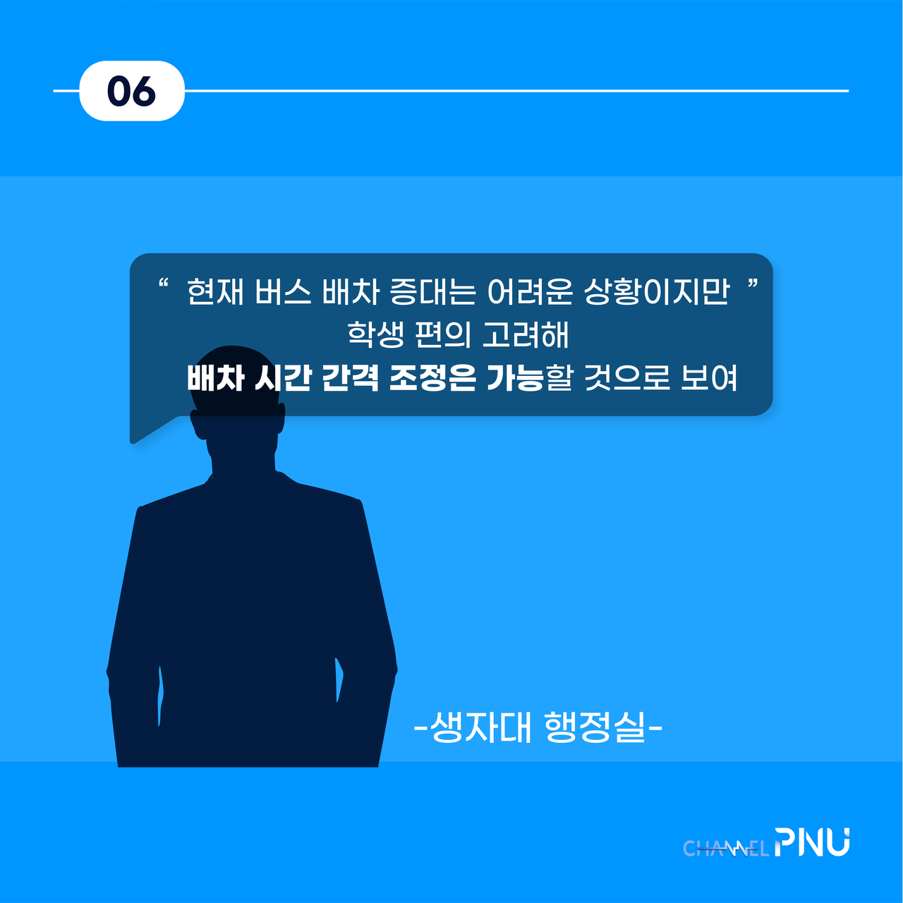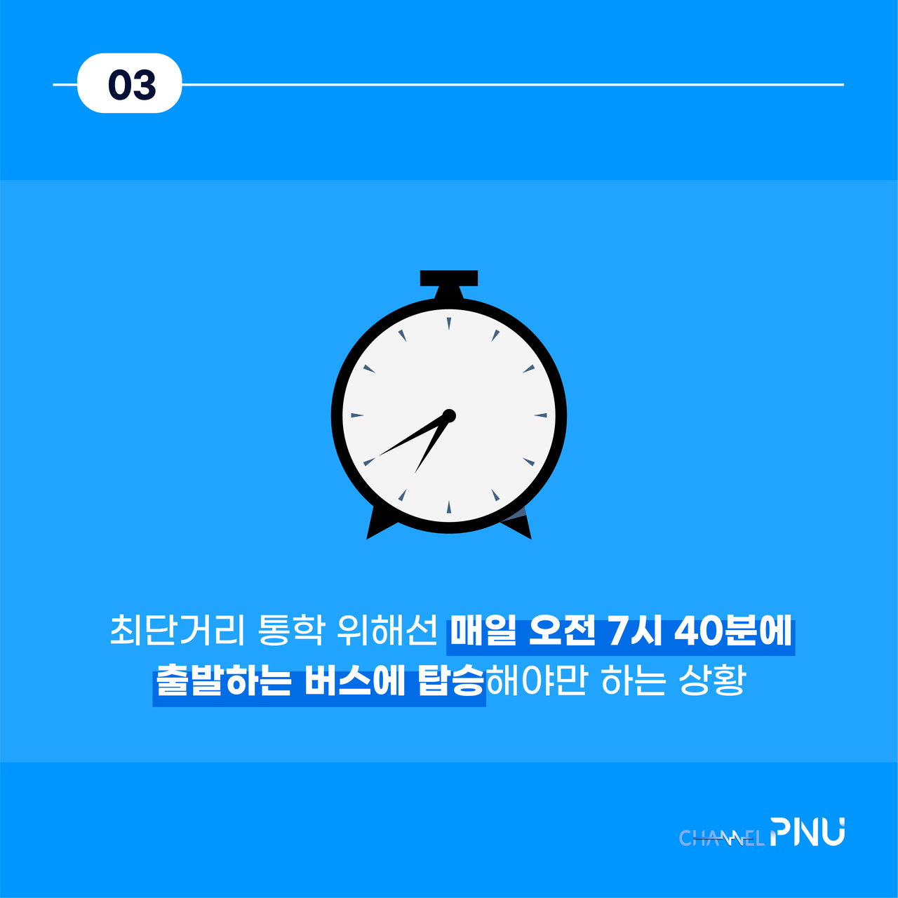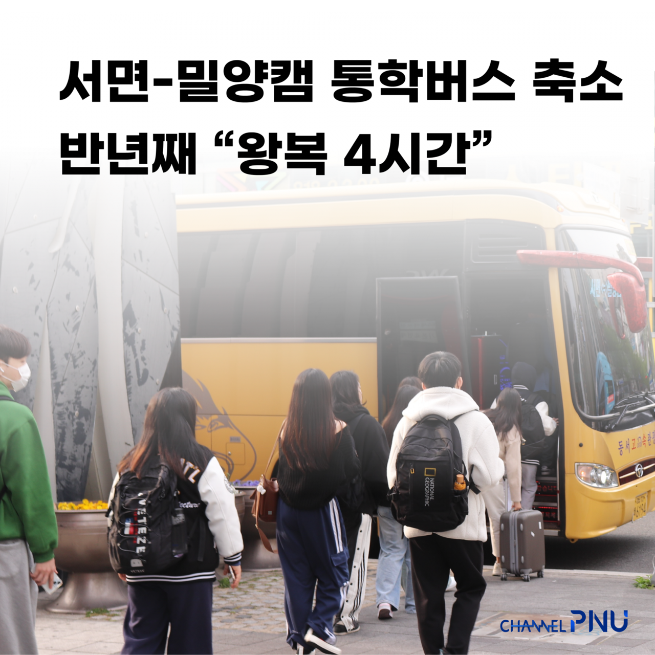 유익해요0공유하고 싶어요0좋아요0화나요0후속기사 원해요0 관련기사 서면-밀양캠 통학버스 축소 반년째 "왕복 4시간" 김채현 기자 banano8877@naver.com 다른기사 보기 저작권자 © 채널PNU 무단전재 및 재배포 금지 당신만 안 본 뉴스 [2026 학생회] 투표 전 필독, 총학 세 후보가 말하는 비전 총학 선본 '온라인 여론 개입' 의혹에 선관위 조사 [2026 학생회] 단과대·동연 후보들 한눈에 보기 [특집] 채널PNU 주최 '총학 후보자와의 만남' 풀영상·전문 공개 총학 선관위원장, 공정성 훼손 논란으로 해임 총학 후보 토론회, 현안 논했지만 구체성은 '글쎄' 부산대 야간 무인 편의점, 화재엔 '무방비' [2026 학생회] 투표 전 필독, 총학 세 후보가 말하는 비전 개의 댓글 회원로그인 작성자 비밀번호 댓글 내용입력 댓글 정렬 최신순 추천순 답글순 BEST댓글 BEST 댓글 답글과 추천수를 합산하여 자동으로 노출됩니다. 닫기 더보기 댓글삭제 삭제한 댓글은 다시 복구할 수 없습니다. 그래도 삭제하시겠습니까? 비밀번호 닫기 댓글수정 댓글 수정은 작성 후 1분내에만 가능합니다. 본문 / 400 비밀번호 닫기 내 댓글 모음 닫기 주요기사 11월 4주 효원알리미 Beyond Borders, Within Growth: PNU Students Share Their Global Stories 총학 후보 토론회, 현안 논했지만 구체성은 '글쎄' Three Candidates Face Off in PNU GSA Election After Nine Years 총학 선관위원장, 공정성 훼손 논란으로 해임 Vacant Houses Reborn as Community Hubs in Busan