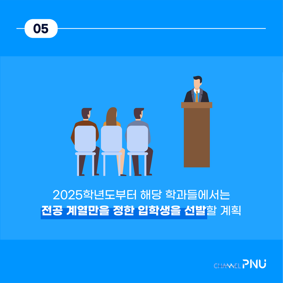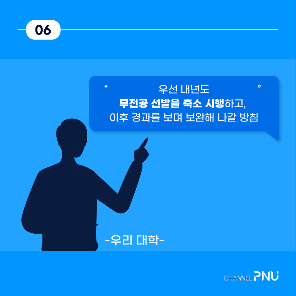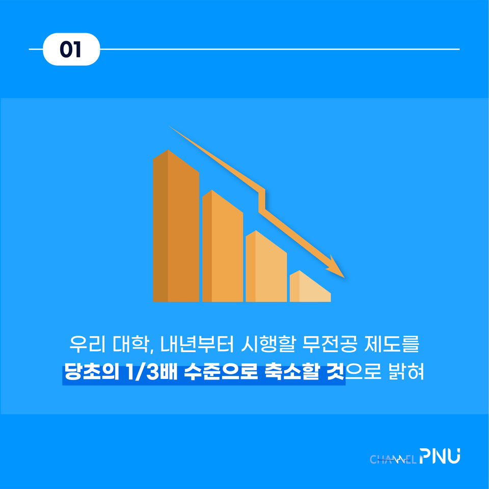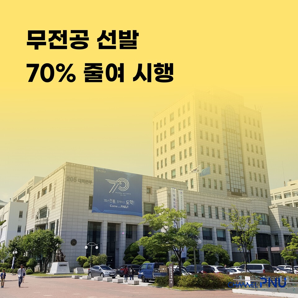 유익해요0공유하고 싶어요0좋아요0화나요0후속기사 원해요0 관련기사 무전공 선발 70% 줄여 시행 김채현 기자 banano8877@naver.com 다른기사 보기 저작권자 © 채널PNU 무단전재 및 재배포 금지 당신만 안 본 뉴스 [2026 학생회] 투표 전 필독, 총학 세 후보가 말하는 비전 총학 선본 '온라인 여론 개입' 의혹에 선관위 조사 [2026 학생회] 단과대·동연 후보들 한눈에 보기 [특집] 채널PNU 주최 '총학 후보자와의 만남' 풀영상·전문 공개 총학 선관위원장, 공정성 훼손 논란으로 해임 총학 후보 토론회, 현안 논했지만 구체성은 '글쎄' 부산대 야간 무인 편의점, 화재엔 '무방비' [2026 학생회] 투표 전 필독, 총학 세 후보가 말하는 비전 개의 댓글 회원로그인 작성자 비밀번호 댓글 내용입력 댓글 정렬 최신순 추천순 답글순 BEST댓글 BEST 댓글 답글과 추천수를 합산하여 자동으로 노출됩니다. 닫기 더보기 댓글삭제 삭제한 댓글은 다시 복구할 수 없습니다. 그래도 삭제하시겠습니까? 비밀번호 닫기 댓글수정 댓글 수정은 작성 후 1분내에만 가능합니다. 본문 / 400 비밀번호 닫기 내 댓글 모음 닫기 주요기사 11월 4주 효원알리미 Beyond Borders, Within Growth: PNU Students Share Their Global Stories 총학 후보 토론회, 현안 논했지만 구체성은 '글쎄' Three Candidates Face Off in PNU GSA Election After Nine Years 총학 선관위원장, 공정성 훼손 논란으로 해임 Vacant Houses Reborn as Community Hubs in Busan