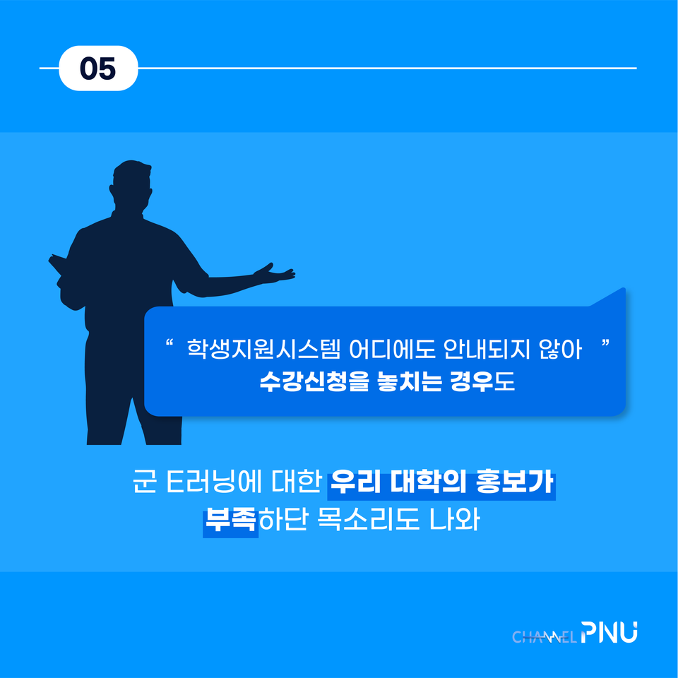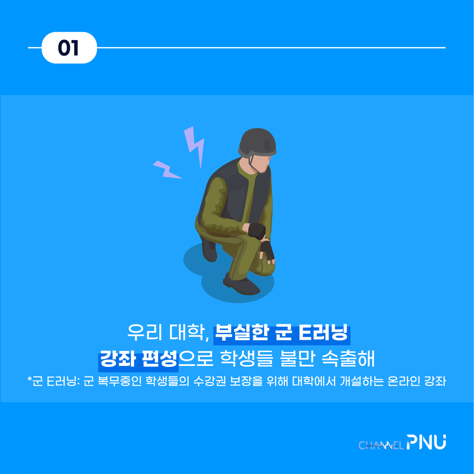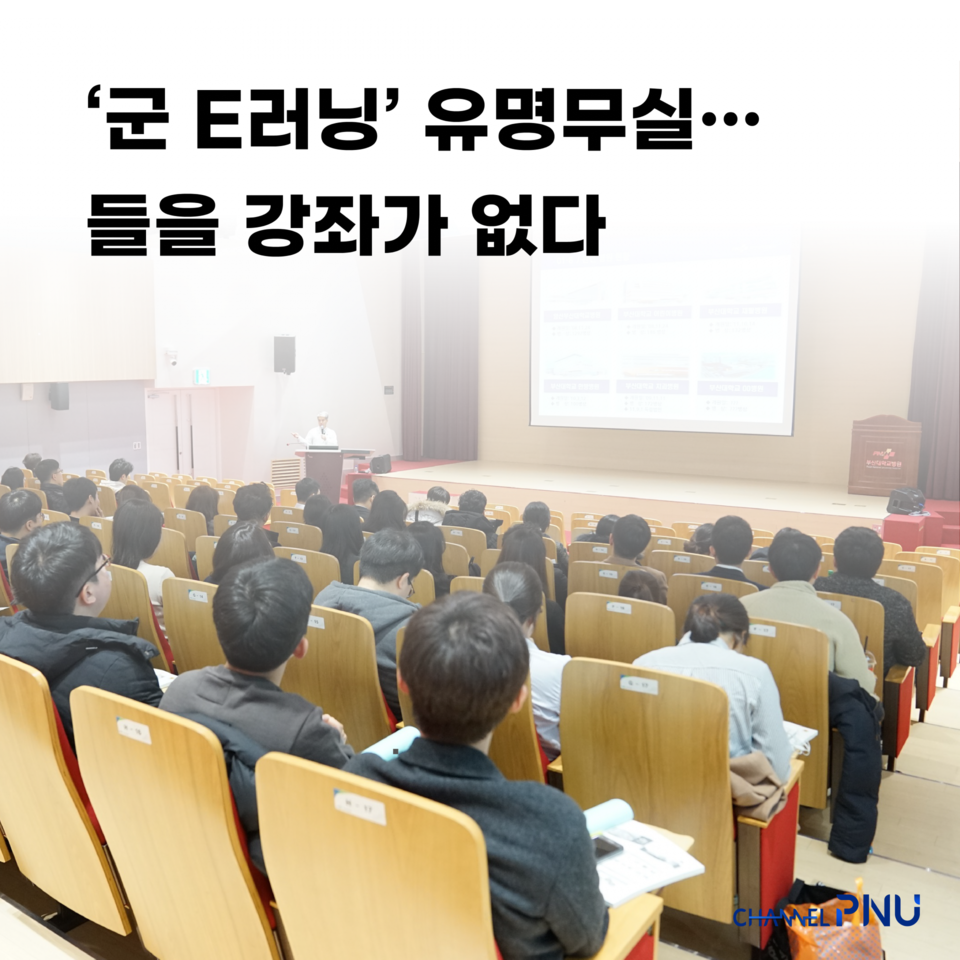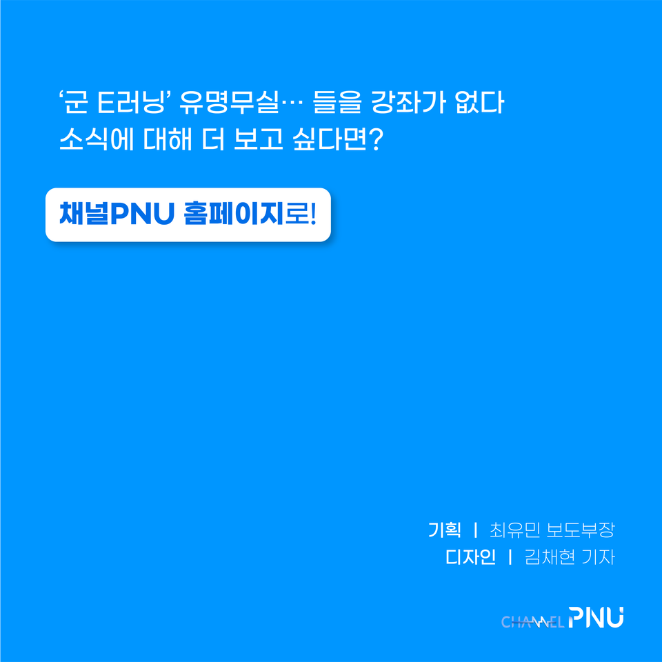 유익해요0공유하고 싶어요0좋아요0화나요0후속기사 원해요0 관련기사 '군 E러닝' 유명무실··· 들을 강좌가 없다 김채현 기자 banano8877@naver.com 다른기사 보기 저작권자 © 채널PNU 무단전재 및 재배포 금지 당신만 안 본 뉴스 [2026 학생회] 투표 전 필독, 총학 세 후보가 말하는 비전 총학 선본 '온라인 여론 개입' 의혹에 선관위 조사 [2026 학생회] 단과대·동연 후보들 한눈에 보기 [특집] 채널PNU 주최 '총학 후보자와의 만남' 풀영상·전문 공개 총학 선관위원장, 공정성 훼손 논란으로 해임 총학 후보 토론회, 현안 논했지만 구체성은 '글쎄' 부산대 야간 무인 편의점, 화재엔 '무방비' [2026 학생회] 투표 전 필독, 총학 세 후보가 말하는 비전 개의 댓글 회원로그인 작성자 비밀번호 댓글 내용입력 댓글 정렬 최신순 추천순 답글순 BEST댓글 BEST 댓글 답글과 추천수를 합산하여 자동으로 노출됩니다. 닫기 더보기 댓글삭제 삭제한 댓글은 다시 복구할 수 없습니다. 그래도 삭제하시겠습니까? 비밀번호 닫기 댓글수정 댓글 수정은 작성 후 1분내에만 가능합니다. 본문 / 400 비밀번호 닫기 내 댓글 모음 닫기 주요기사 11월 4주 효원알리미 Beyond Borders, Within Growth: PNU Students Share Their Global Stories 총학 후보 토론회, 현안 논했지만 구체성은 '글쎄' Three Candidates Face Off in PNU GSA Election After Nine Years 총학 선관위원장, 공정성 훼손 논란으로 해임 Vacant Houses Reborn as Community Hubs in Busan