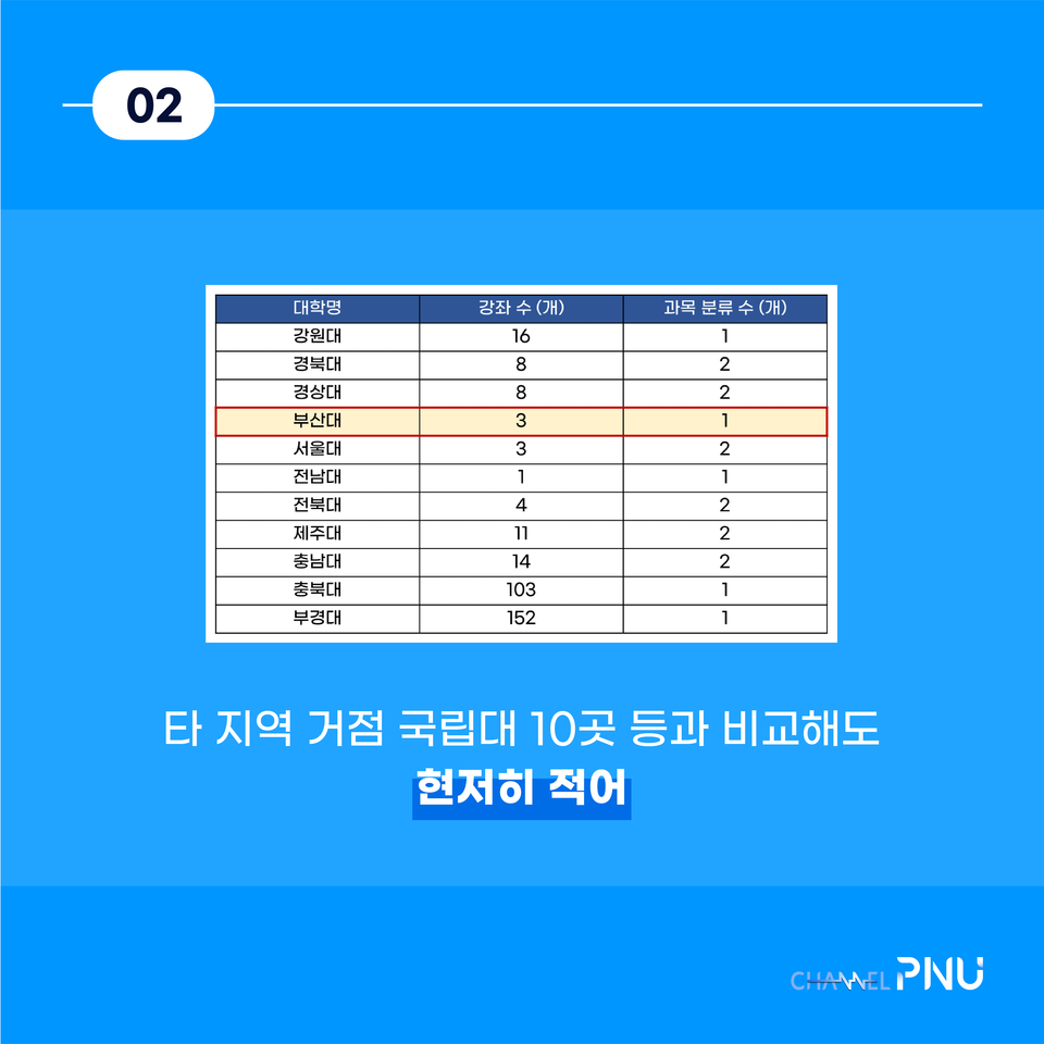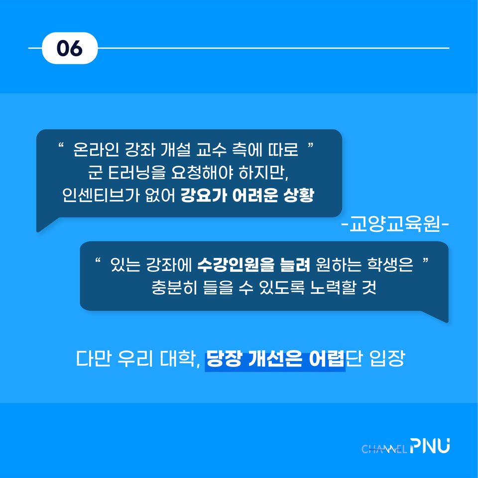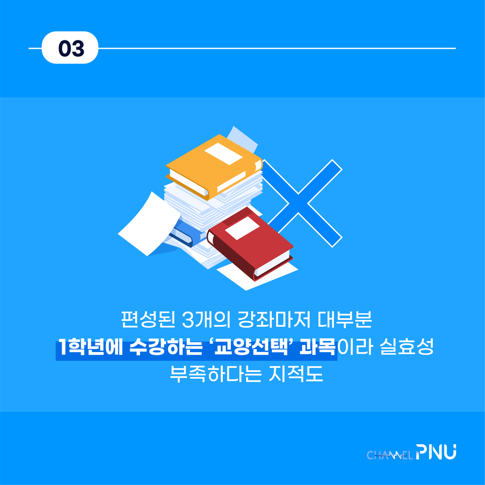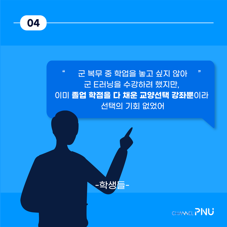 유익해요0공유하고 싶어요0좋아요0화나요0후속기사 원해요0 관련기사 '군 E러닝' 유명무실··· 들을 강좌가 없다 김채현 기자 banano8877@naver.com 다른기사 보기 저작권자 © 채널PNU 무단전재 및 재배포 금지 당신만 안 본 뉴스 [2026 학생회] 투표 전 필독, 총학 세 후보가 말하는 비전 총학 선본 '온라인 여론 개입' 의혹에 선관위 조사 [2026 학생회] 단과대·동연 후보들 한눈에 보기 [특집] 채널PNU 주최 '총학 후보자와의 만남' 풀영상·전문 공개 총학 선관위원장, 공정성 훼손 논란으로 해임 총학 후보 토론회, 현안 논했지만 구체성은 '글쎄' 부산대 야간 무인 편의점, 화재엔 '무방비' [2026 학생회] 투표 전 필독, 총학 세 후보가 말하는 비전 개의 댓글 회원로그인 작성자 비밀번호 댓글 내용입력 댓글 정렬 최신순 추천순 답글순 BEST댓글 BEST 댓글 답글과 추천수를 합산하여 자동으로 노출됩니다. 닫기 더보기 댓글삭제 삭제한 댓글은 다시 복구할 수 없습니다. 그래도 삭제하시겠습니까? 비밀번호 닫기 댓글수정 댓글 수정은 작성 후 1분내에만 가능합니다. 본문 / 400 비밀번호 닫기 내 댓글 모음 닫기 주요기사 11월 4주 효원알리미 Beyond Borders, Within Growth: PNU Students Share Their Global Stories 총학 후보 토론회, 현안 논했지만 구체성은 '글쎄' Three Candidates Face Off in PNU GSA Election After Nine Years 총학 선관위원장, 공정성 훼손 논란으로 해임 Vacant Houses Reborn as Community Hubs in Busan