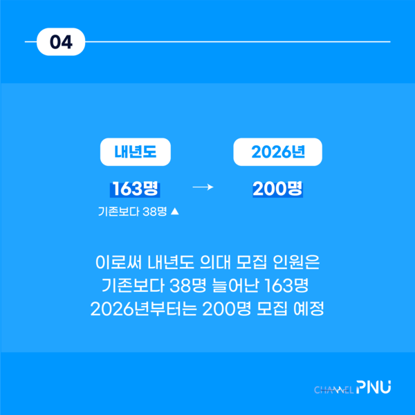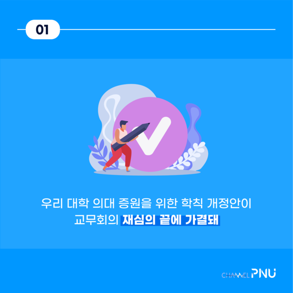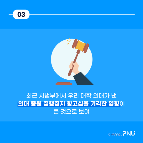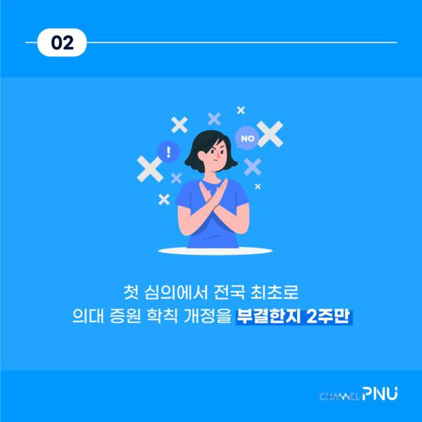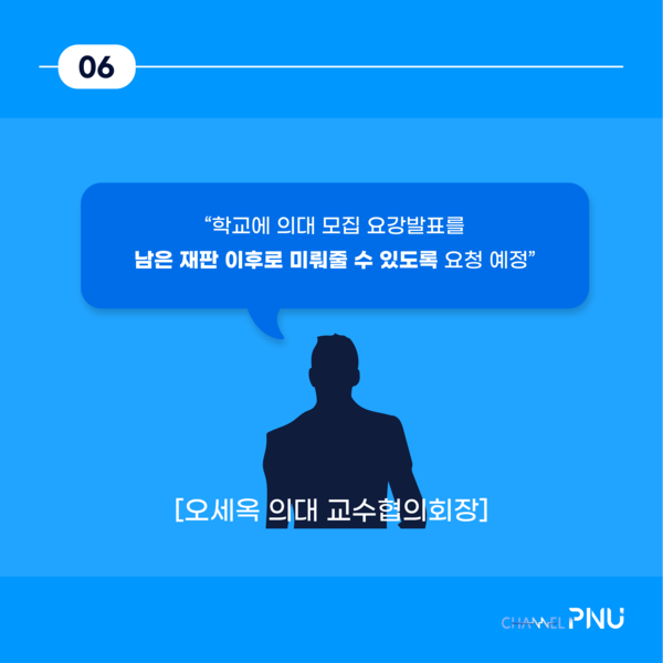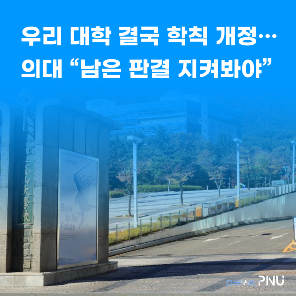 유익해요0공유하고 싶어요0좋아요0화나요0후속기사 원해요0 관련기사 우리 대학 결국 학칙 개정··· 의대 "남은 판결 지켜봐야" 머리 맞댄 의대 총장들, 정부에 지원책 요구 정혜미 기자 jhm4510@naver.com 다른기사 보기 저작권자 © 채널PNU 무단전재 및 재배포 금지 당신만 안 본 뉴스 [2026 학생회] 투표 전 필독, 총학 세 후보가 말하는 비전 총학 선본 '온라인 여론 개입' 의혹에 선관위 조사 [2026 학생회] 단과대·동연 후보들 한눈에 보기 [특집] 채널PNU 주최 '총학 후보자와의 만남' 풀영상·전문 공개 총학 선관위원장, 공정성 훼손 논란으로 해임 총학 후보 토론회, 현안 논했지만 구체성은 '글쎄' 부산대 야간 무인 편의점, 화재엔 '무방비' [2026 학생회] 투표 전 필독, 총학 세 후보가 말하는 비전 개의 댓글 회원로그인 작성자 비밀번호 댓글 내용입력 댓글 정렬 최신순 추천순 답글순 BEST댓글 BEST 댓글 답글과 추천수를 합산하여 자동으로 노출됩니다. 닫기 더보기 댓글삭제 삭제한 댓글은 다시 복구할 수 없습니다. 그래도 삭제하시겠습니까? 비밀번호 닫기 댓글수정 댓글 수정은 작성 후 1분내에만 가능합니다. 본문 / 400 비밀번호 닫기 내 댓글 모음 닫기 주요기사 11월 4주 효원알리미 Beyond Borders, Within Growth: PNU Students Share Their Global Stories 총학 후보 토론회, 현안 논했지만 구체성은 '글쎄' Three Candidates Face Off in PNU GSA Election After Nine Years 총학 선관위원장, 공정성 훼손 논란으로 해임 Vacant Houses Reborn as Community Hubs in Busan