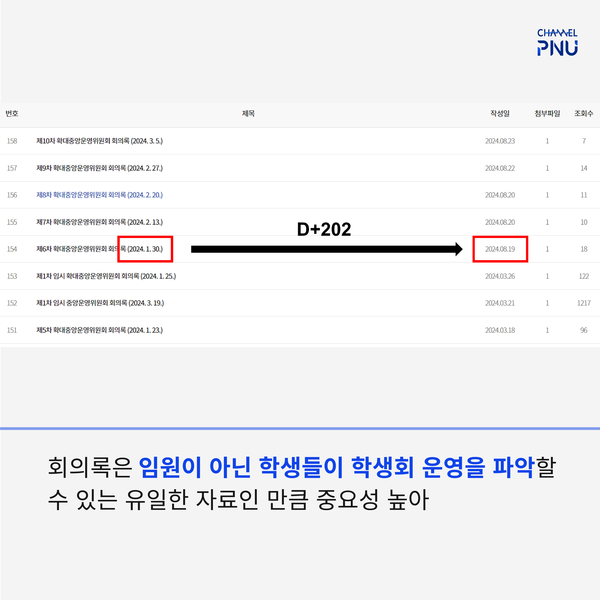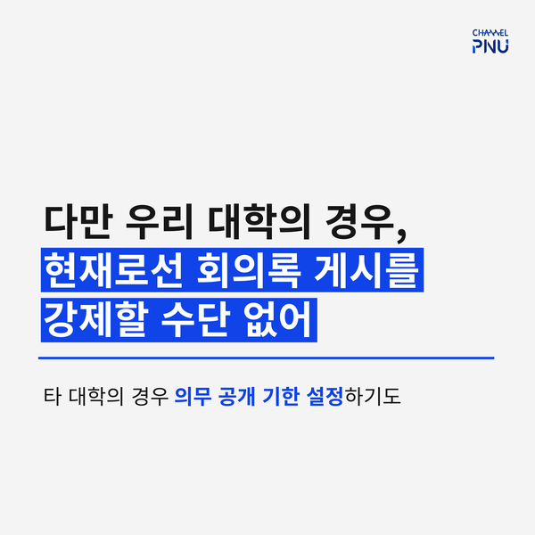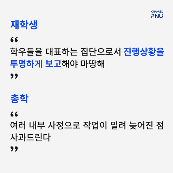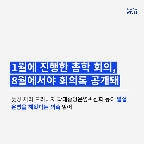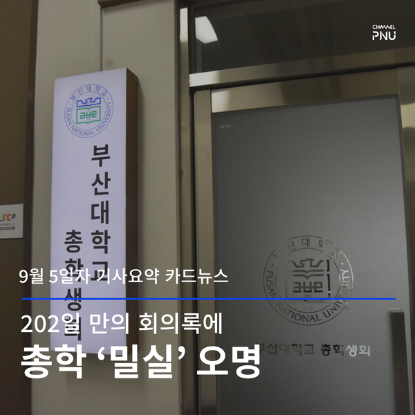 유익해요0공유하고 싶어요0좋아요0화나요0후속기사 원해요0 관련기사 202일 만의 회의록에 총학 '밀실' 오명 정혜미 기자 jhm4510@naver.com 다른기사 보기 저작권자 © 채널PNU 무단전재 및 재배포 금지 당신만 안 본 뉴스 [2026 학생회] 투표 전 필독, 총학 세 후보가 말하는 비전 총학 선본 '온라인 여론 개입' 의혹에 선관위 조사 [2026 학생회] 단과대·동연 후보들 한눈에 보기 [특집] 채널PNU 주최 '총학 후보자와의 만남' 풀영상·전문 공개 총학 선관위원장, 공정성 훼손 논란으로 해임 총학 후보 토론회, 현안 논했지만 구체성은 '글쎄' 부산대 야간 무인 편의점, 화재엔 '무방비' [2026 학생회] 투표 전 필독, 총학 세 후보가 말하는 비전 개의 댓글 회원로그인 작성자 비밀번호 댓글 내용입력 댓글 정렬 최신순 추천순 답글순 BEST댓글 BEST 댓글 답글과 추천수를 합산하여 자동으로 노출됩니다. 닫기 더보기 댓글삭제 삭제한 댓글은 다시 복구할 수 없습니다. 그래도 삭제하시겠습니까? 비밀번호 닫기 댓글수정 댓글 수정은 작성 후 1분내에만 가능합니다. 본문 / 400 비밀번호 닫기 내 댓글 모음 닫기 주요기사 11월 4주 효원알리미 Beyond Borders, Within Growth: PNU Students Share Their Global Stories 총학 후보 토론회, 현안 논했지만 구체성은 '글쎄' Three Candidates Face Off in PNU GSA Election After Nine Years 총학 선관위원장, 공정성 훼손 논란으로 해임 Vacant Houses Reborn as Community Hubs in Busan