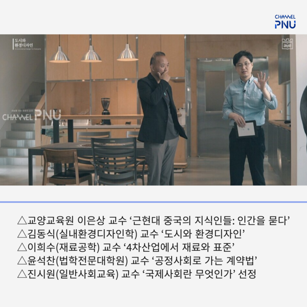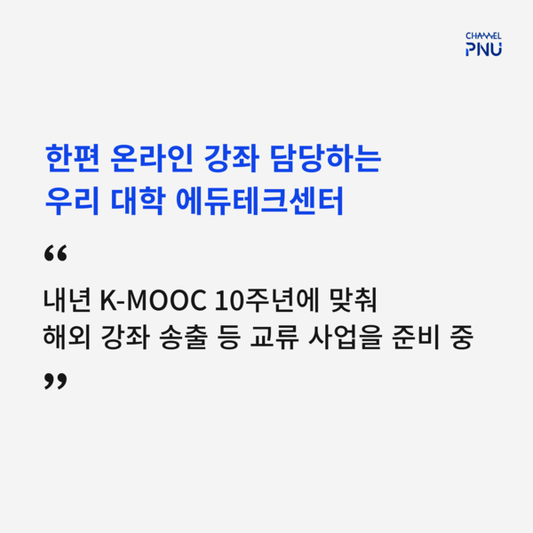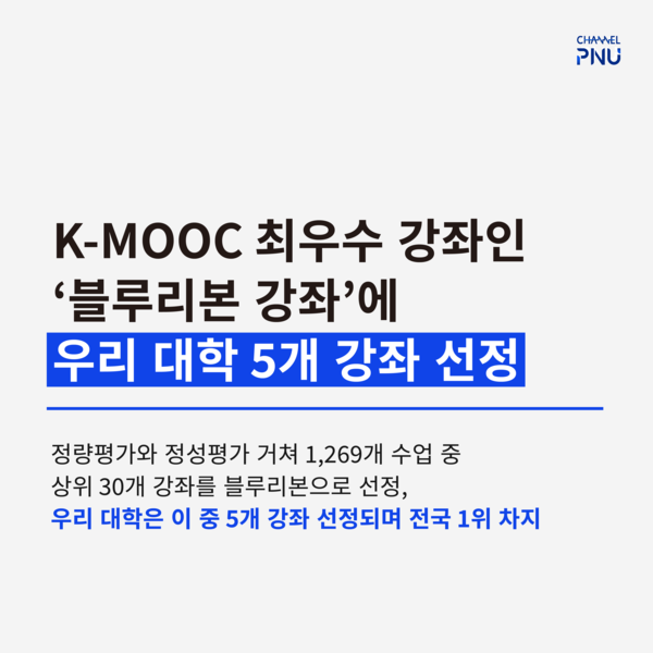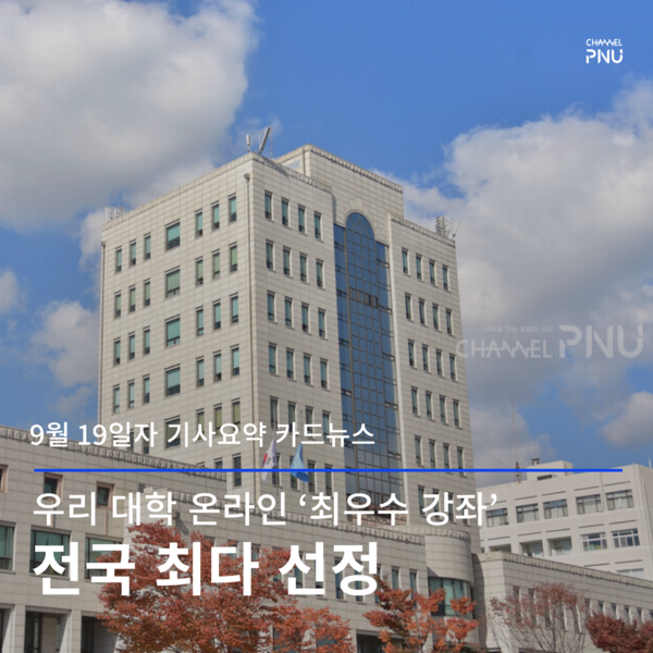 유익해요0공유하고 싶어요0좋아요0화나요0후속기사 원해요0 관련기사 우리 대학 온라인 '최우수 강좌' 전국 최다 선정 김나경 기자 nk898538@gmail.com 다른기사 보기 저작권자 © 채널PNU 무단전재 및 재배포 금지 당신만 안 본 뉴스 [2026 학생회] 투표 전 필독, 총학 세 후보가 말하는 비전 총학 선본 '온라인 여론 개입' 의혹에 선관위 조사 [2026 학생회] 단과대·동연 후보들 한눈에 보기 [특집] 채널PNU 주최 '총학 후보자와의 만남' 풀영상·전문 공개 총학 선관위원장, 공정성 훼손 논란으로 해임 총학 후보 토론회, 현안 논했지만 구체성은 '글쎄' 부산대 야간 무인 편의점, 화재엔 '무방비' [2026 학생회] 투표 전 필독, 총학 세 후보가 말하는 비전 개의 댓글 회원로그인 작성자 비밀번호 댓글 내용입력 댓글 정렬 최신순 추천순 답글순 BEST댓글 BEST 댓글 답글과 추천수를 합산하여 자동으로 노출됩니다. 닫기 더보기 댓글삭제 삭제한 댓글은 다시 복구할 수 없습니다. 그래도 삭제하시겠습니까? 비밀번호 닫기 댓글수정 댓글 수정은 작성 후 1분내에만 가능합니다. 본문 / 400 비밀번호 닫기 내 댓글 모음 닫기 주요기사 11월 4주 효원알리미 Beyond Borders, Within Growth: PNU Students Share Their Global Stories 총학 후보 토론회, 현안 논했지만 구체성은 '글쎄' Three Candidates Face Off in PNU GSA Election After Nine Years 총학 선관위원장, 공정성 훼손 논란으로 해임 Vacant Houses Reborn as Community Hubs in Busan