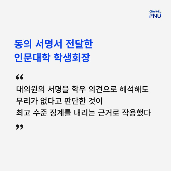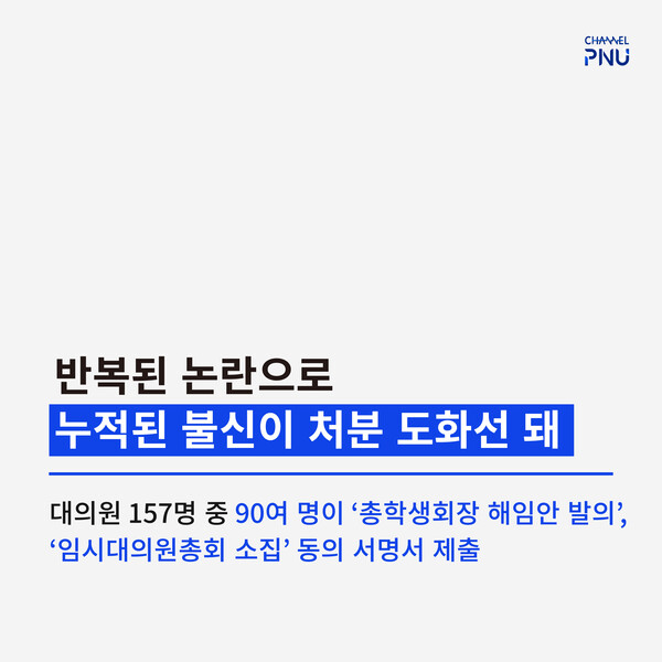 유익해요0공유하고 싶어요0좋아요0화나요0후속기사 원해요0 관련기사 학생사회 불신 속 총학생회장 불명예 퇴진 [영상] 칼 빼든 부산대 학생사회 총학생회장 불명예 퇴진 [속보] 총학생회장 파면 '최고 징계' 김나경 기자 nk898538@gmail.com 다른기사 보기 저작권자 © 채널PNU 무단전재 및 재배포 금지 당신만 안 본 뉴스 [2026 학생회] 투표 전 필독, 총학 세 후보가 말하는 비전 총학 선본 '온라인 여론 개입' 의혹에 선관위 조사 [2026 학생회] 단과대·동연 후보들 한눈에 보기 [특집] 채널PNU 주최 '총학 후보자와의 만남' 풀영상·전문 공개 총학 선관위원장, 공정성 훼손 논란으로 해임 총학 후보 토론회, 현안 논했지만 구체성은 '글쎄' 부산대 야간 무인 편의점, 화재엔 '무방비' [2026 학생회] 투표 전 필독, 총학 세 후보가 말하는 비전 개의 댓글 회원로그인 작성자 비밀번호 댓글 내용입력 댓글 정렬 최신순 추천순 답글순 BEST댓글 BEST 댓글 답글과 추천수를 합산하여 자동으로 노출됩니다. 닫기 더보기 댓글삭제 삭제한 댓글은 다시 복구할 수 없습니다. 그래도 삭제하시겠습니까? 비밀번호 닫기 댓글수정 댓글 수정은 작성 후 1분내에만 가능합니다. 본문 / 400 비밀번호 닫기 내 댓글 모음 닫기 주요기사 11월 4주 효원알리미 Beyond Borders, Within Growth: PNU Students Share Their Global Stories 총학 후보 토론회, 현안 논했지만 구체성은 '글쎄' Three Candidates Face Off in PNU GSA Election After Nine Years 총학 선관위원장, 공정성 훼손 논란으로 해임 Vacant Houses Reborn as Community Hubs in Busan