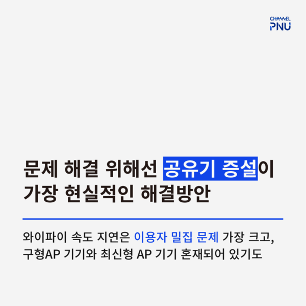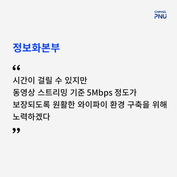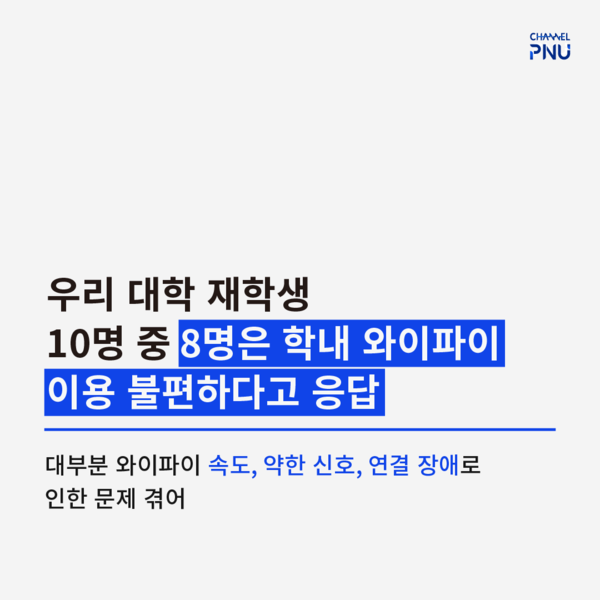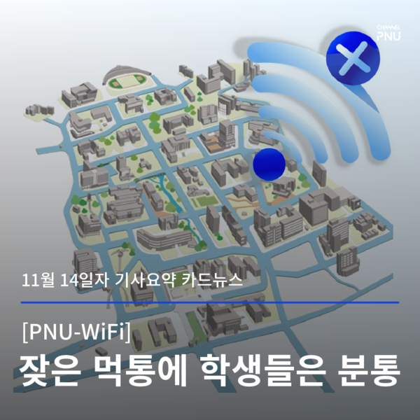 유익해요0공유하고 싶어요0좋아요0화나요0후속기사 원해요0 관련기사 [PNU-WiFi] 정보화본부 "적극 대응" 약속 [PNU-WiFi] 잦은 먹통에 학생들은 분통 정미정 기자 mijung04@pusan.ac.kr 다른기사 보기 저작권자 © 채널PNU 무단전재 및 재배포 금지 당신만 안 본 뉴스 [2026 학생회] 투표 전 필독, 총학 세 후보가 말하는 비전 총학 선본 '온라인 여론 개입' 의혹에 선관위 조사 [2026 학생회] 단과대·동연 후보들 한눈에 보기 [특집] 채널PNU 주최 '총학 후보자와의 만남' 풀영상·전문 공개 총학 선관위원장, 공정성 훼손 논란으로 해임 총학 후보 토론회, 현안 논했지만 구체성은 '글쎄' 부산대 야간 무인 편의점, 화재엔 '무방비' [2026 학생회] 투표 전 필독, 총학 세 후보가 말하는 비전 개의 댓글 회원로그인 작성자 비밀번호 댓글 내용입력 댓글 정렬 최신순 추천순 답글순 BEST댓글 BEST 댓글 답글과 추천수를 합산하여 자동으로 노출됩니다. 닫기 더보기 댓글삭제 삭제한 댓글은 다시 복구할 수 없습니다. 그래도 삭제하시겠습니까? 비밀번호 닫기 댓글수정 댓글 수정은 작성 후 1분내에만 가능합니다. 본문 / 400 비밀번호 닫기 내 댓글 모음 닫기 주요기사 11월 4주 효원알리미 Beyond Borders, Within Growth: PNU Students Share Their Global Stories 총학 후보 토론회, 현안 논했지만 구체성은 '글쎄' Three Candidates Face Off in PNU GSA Election After Nine Years 총학 선관위원장, 공정성 훼손 논란으로 해임 Vacant Houses Reborn as Community Hubs in Busan