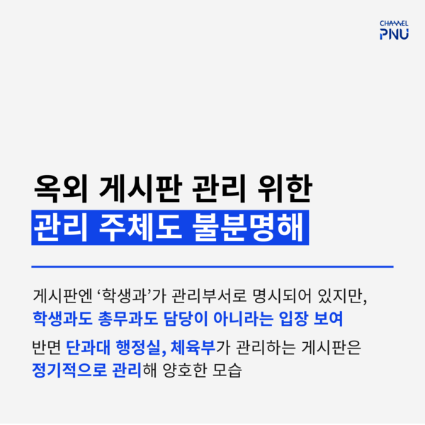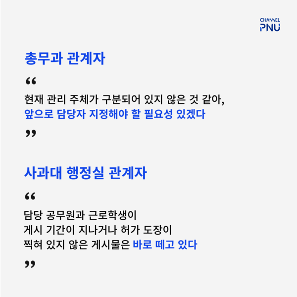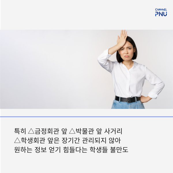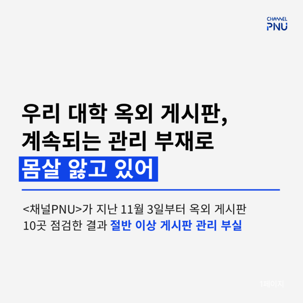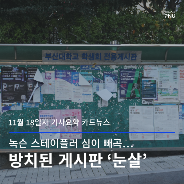 유익해요0공유하고 싶어요0좋아요0화나요0후속기사 원해요0 관련기사 녹슨 스테이플러 심이 빼곡··· 방치된 게시판 '눈살' Rusty Staples Reflect Poor Management of Bulletin Boards 박건희 geonhui1224@naver.com 다른기사 보기 저작권자 © 채널PNU 무단전재 및 재배포 금지 당신만 안 본 뉴스 [2026 학생회] 투표 전 필독, 총학 세 후보가 말하는 비전 총학 선본 '온라인 여론 개입' 의혹에 선관위 조사 [2026 학생회] 단과대·동연 후보들 한눈에 보기 [특집] 채널PNU 주최 '총학 후보자와의 만남' 풀영상·전문 공개 총학 선관위원장, 공정성 훼손 논란으로 해임 총학 후보 토론회, 현안 논했지만 구체성은 '글쎄' 부산대 야간 무인 편의점, 화재엔 '무방비' [2026 학생회] 투표 전 필독, 총학 세 후보가 말하는 비전 개의 댓글 회원로그인 작성자 비밀번호 댓글 내용입력 댓글 정렬 최신순 추천순 답글순 BEST댓글 BEST 댓글 답글과 추천수를 합산하여 자동으로 노출됩니다. 닫기 더보기 댓글삭제 삭제한 댓글은 다시 복구할 수 없습니다. 그래도 삭제하시겠습니까? 비밀번호 닫기 댓글수정 댓글 수정은 작성 후 1분내에만 가능합니다. 본문 / 400 비밀번호 닫기 내 댓글 모음 닫기 주요기사 11월 4주 효원알리미 Beyond Borders, Within Growth: PNU Students Share Their Global Stories 총학 후보 토론회, 현안 논했지만 구체성은 '글쎄' Three Candidates Face Off in PNU GSA Election After Nine Years 총학 선관위원장, 공정성 훼손 논란으로 해임 Vacant Houses Reborn as Community Hubs in Busan