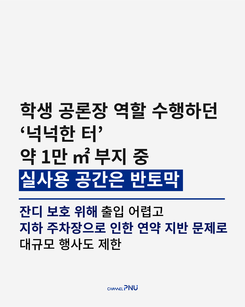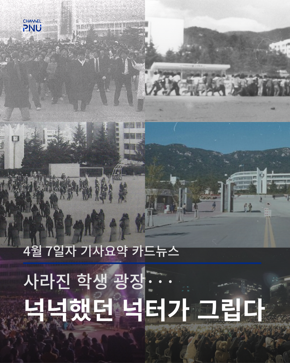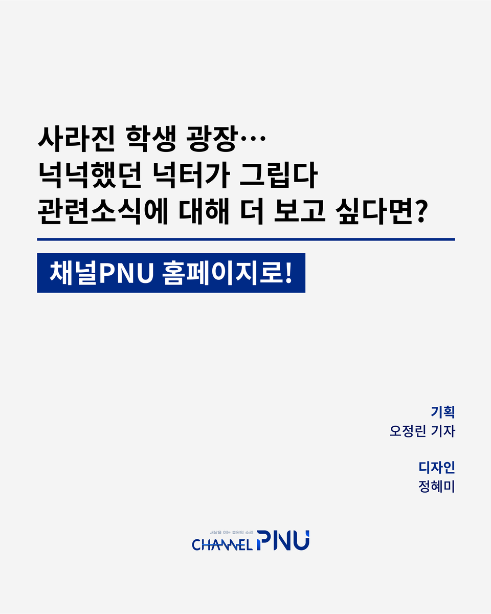 유익해요0공유하고 싶어요0좋아요0화나요0후속기사 원해요0 관련기사 [영상] 사라진 부산대 학생 광장 넉넉했던 넉터가 그립다 정혜미 기자 jhm4510@naver.com 다른기사 보기 저작권자 © 채널PNU 무단전재 및 재배포 금지 당신만 안 본 뉴스 [2026 학생회] 투표 전 필독, 총학 세 후보가 말하는 비전 총학 선본 '온라인 여론 개입' 의혹에 선관위 조사 [2026 학생회] 단과대·동연 후보들 한눈에 보기 [특집] 채널PNU 주최 '총학 후보자와의 만남' 풀영상·전문 공개 총학 선관위원장, 공정성 훼손 논란으로 해임 총학 후보 토론회, 현안 논했지만 구체성은 '글쎄' 부산대 야간 무인 편의점, 화재엔 '무방비' [2026 학생회] 투표 전 필독, 총학 세 후보가 말하는 비전 개의 댓글 회원로그인 작성자 비밀번호 댓글 내용입력 댓글 정렬 최신순 추천순 답글순 BEST댓글 BEST 댓글 답글과 추천수를 합산하여 자동으로 노출됩니다. 닫기 더보기 댓글삭제 삭제한 댓글은 다시 복구할 수 없습니다. 그래도 삭제하시겠습니까? 비밀번호 닫기 댓글수정 댓글 수정은 작성 후 1분내에만 가능합니다. 본문 / 400 비밀번호 닫기 내 댓글 모음 닫기 주요기사 11월 4주 효원알리미 Beyond Borders, Within Growth: PNU Students Share Their Global Stories 총학 후보 토론회, 현안 논했지만 구체성은 '글쎄' Three Candidates Face Off in PNU GSA Election After Nine Years 총학 선관위원장, 공정성 훼손 논란으로 해임 Vacant Houses Reborn as Community Hubs in Busan