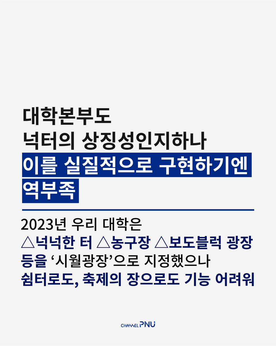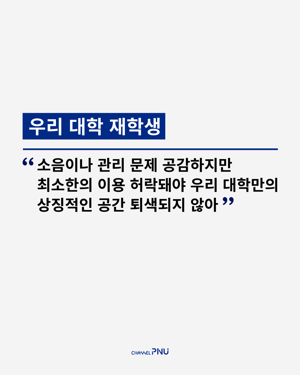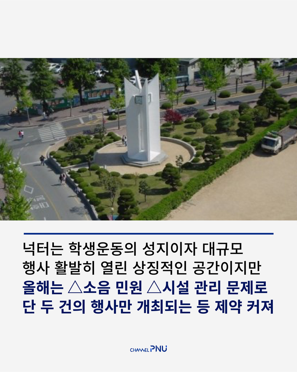 유익해요0공유하고 싶어요0좋아요0화나요0후속기사 원해요0 관련기사 [영상] 사라진 부산대 학생 광장 넉넉했던 넉터가 그립다 정혜미 기자 jhm4510@naver.com 다른기사 보기 저작권자 © 채널PNU 무단전재 및 재배포 금지 당신만 안 본 뉴스 [2026 학생회] 투표 전 필독, 총학 세 후보가 말하는 비전 총학 선본 '온라인 여론 개입' 의혹에 선관위 조사 [2026 학생회] 단과대·동연 후보들 한눈에 보기 [특집] 채널PNU 주최 '총학 후보자와의 만남' 풀영상·전문 공개 총학 선관위원장, 공정성 훼손 논란으로 해임 총학 후보 토론회, 현안 논했지만 구체성은 '글쎄' 부산대 야간 무인 편의점, 화재엔 '무방비' [2026 학생회] 투표 전 필독, 총학 세 후보가 말하는 비전 개의 댓글 회원로그인 작성자 비밀번호 댓글 내용입력 댓글 정렬 최신순 추천순 답글순 BEST댓글 BEST 댓글 답글과 추천수를 합산하여 자동으로 노출됩니다. 닫기 더보기 댓글삭제 삭제한 댓글은 다시 복구할 수 없습니다. 그래도 삭제하시겠습니까? 비밀번호 닫기 댓글수정 댓글 수정은 작성 후 1분내에만 가능합니다. 본문 / 400 비밀번호 닫기 내 댓글 모음 닫기 주요기사 11월 4주 효원알리미 Beyond Borders, Within Growth: PNU Students Share Their Global Stories 총학 후보 토론회, 현안 논했지만 구체성은 '글쎄' Three Candidates Face Off in PNU GSA Election After Nine Years 총학 선관위원장, 공정성 훼손 논란으로 해임 Vacant Houses Reborn as Community Hubs in Busan