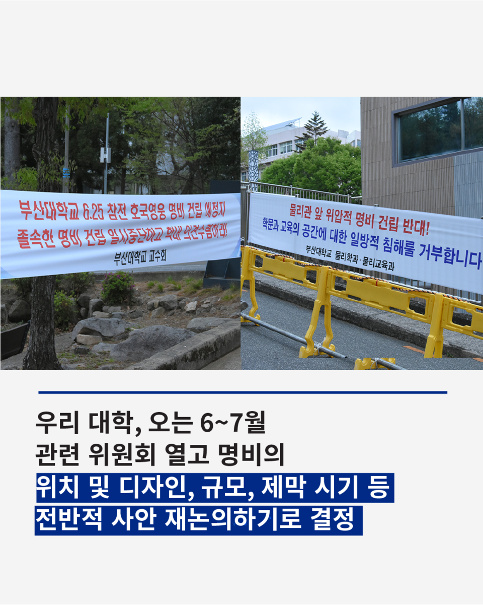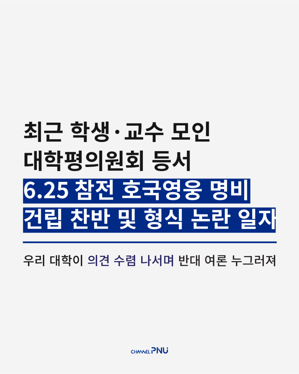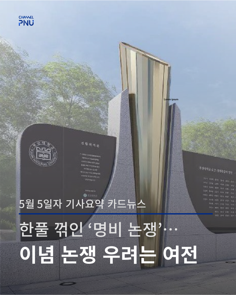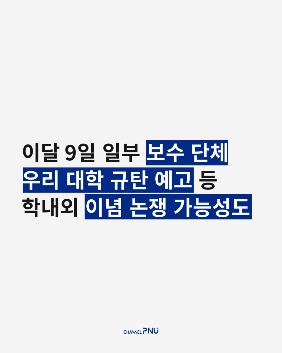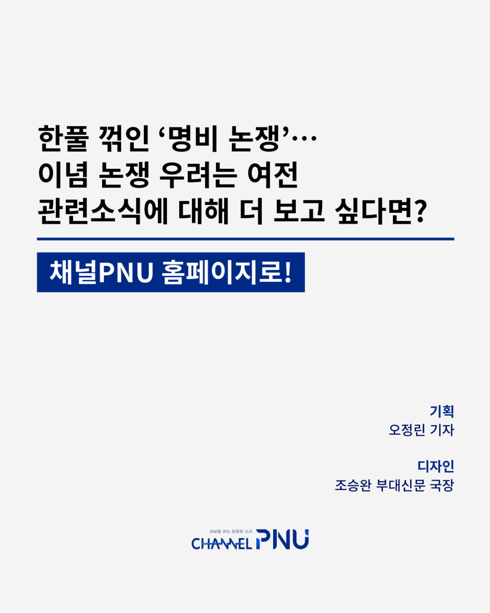 유익해요0공유하고 싶어요0좋아요0화나요0후속기사 원해요0 관련기사 [영상] 이목 끈 부산대 명비 건립 이념 논쟁일까 우려 여전 채널PNU channelpnu@pusan.ac.kr 다른기사 보기 저작권자 © 채널PNU 무단전재 및 재배포 금지 당신만 안 본 뉴스 [2026 학생회] 투표 전 필독, 총학 세 후보가 말하는 비전 총학 선본 '온라인 여론 개입' 의혹에 선관위 조사 [2026 학생회] 단과대·동연 후보들 한눈에 보기 [특집] 채널PNU 주최 '총학 후보자와의 만남' 풀영상·전문 공개 총학 선관위원장, 공정성 훼손 논란으로 해임 총학 후보 토론회, 현안 논했지만 구체성은 '글쎄' 부산대 야간 무인 편의점, 화재엔 '무방비' [2026 학생회] 투표 전 필독, 총학 세 후보가 말하는 비전 개의 댓글 회원로그인 작성자 비밀번호 댓글 내용입력 댓글 정렬 최신순 추천순 답글순 BEST댓글 BEST 댓글 답글과 추천수를 합산하여 자동으로 노출됩니다. 닫기 더보기 댓글삭제 삭제한 댓글은 다시 복구할 수 없습니다. 그래도 삭제하시겠습니까? 비밀번호 닫기 댓글수정 댓글 수정은 작성 후 1분내에만 가능합니다. 본문 / 400 비밀번호 닫기 내 댓글 모음 닫기 주요기사 11월 4주 효원알리미 Beyond Borders, Within Growth: PNU Students Share Their Global Stories 총학 후보 토론회, 현안 논했지만 구체성은 '글쎄' Three Candidates Face Off in PNU GSA Election After Nine Years 총학 선관위원장, 공정성 훼손 논란으로 해임 Vacant Houses Reborn as Community Hubs in Busan