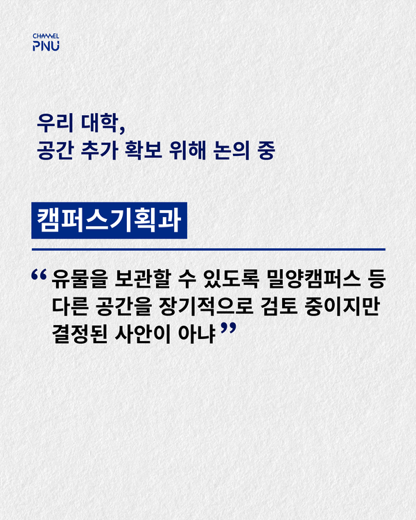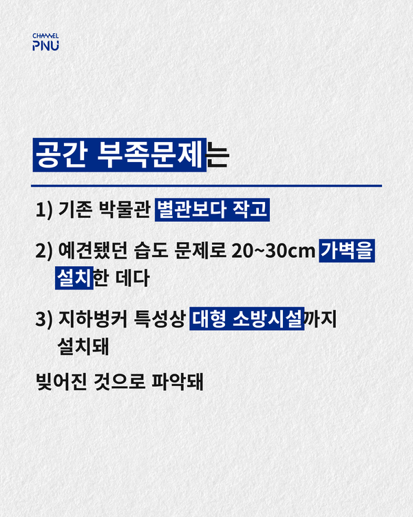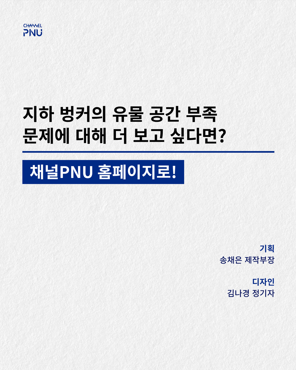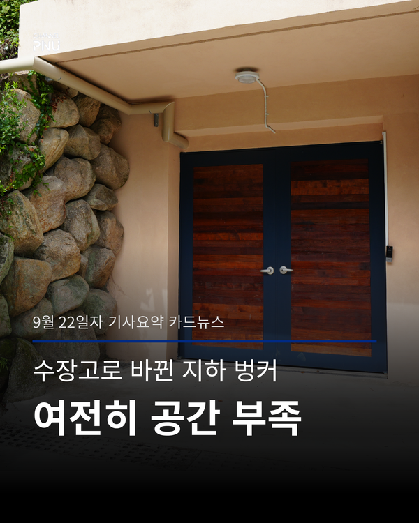 유익해요0공유하고 싶어요0좋아요0화나요0후속기사 원해요0 관련기사 수장고로 개조된 지하 벙커, 공간 부족은 여전 김나경 기자 nk898538@gmail.com 다른기사 보기 저작권자 © 채널PNU 무단전재 및 재배포 금지 당신만 안 본 뉴스 [2026 학생회] 투표 전 필독, 총학 세 후보가 말하는 비전 총학 선본 '온라인 여론 개입' 의혹에 선관위 조사 [2026 학생회] 단과대·동연 후보들 한눈에 보기 [특집] 채널PNU 주최 '총학 후보자와의 만남' 풀영상·전문 공개 총학 선관위원장, 공정성 훼손 논란으로 해임 총학 후보 토론회, 현안 논했지만 구체성은 '글쎄' 부산대 야간 무인 편의점, 화재엔 '무방비' [2026 학생회] 투표 전 필독, 총학 세 후보가 말하는 비전 개의 댓글 회원로그인 작성자 비밀번호 댓글 내용입력 댓글 정렬 최신순 추천순 답글순 BEST댓글 BEST 댓글 답글과 추천수를 합산하여 자동으로 노출됩니다. 닫기 더보기 댓글삭제 삭제한 댓글은 다시 복구할 수 없습니다. 그래도 삭제하시겠습니까? 비밀번호 닫기 댓글수정 댓글 수정은 작성 후 1분내에만 가능합니다. 본문 / 400 비밀번호 닫기 내 댓글 모음 닫기 주요기사 11월 4주 효원알리미 Beyond Borders, Within Growth: PNU Students Share Their Global Stories 총학 후보 토론회, 현안 논했지만 구체성은 '글쎄' Three Candidates Face Off in PNU GSA Election After Nine Years 총학 선관위원장, 공정성 훼손 논란으로 해임 Vacant Houses Reborn as Community Hubs in Busan