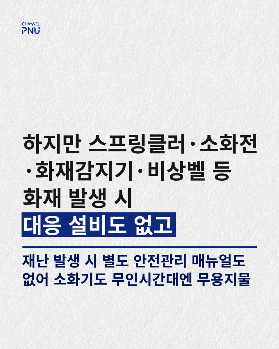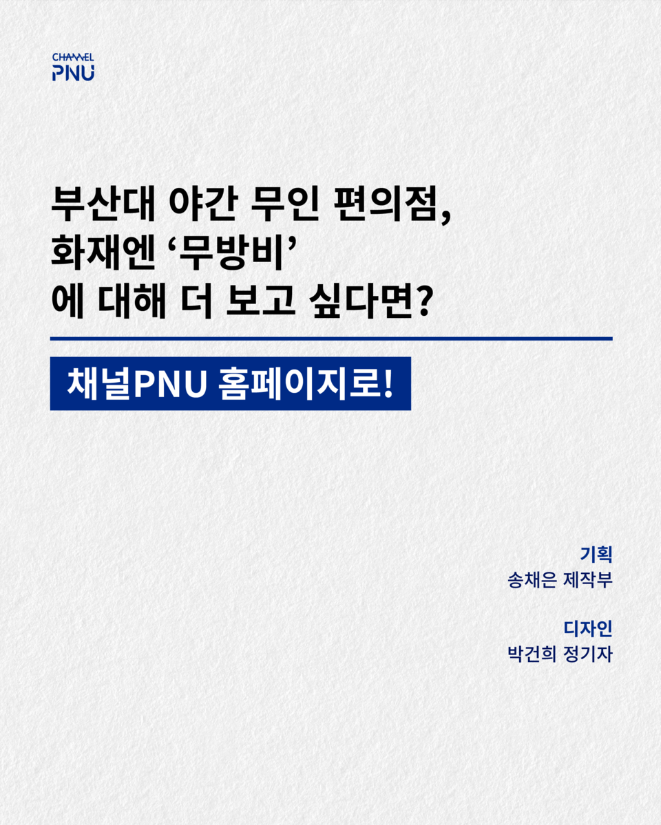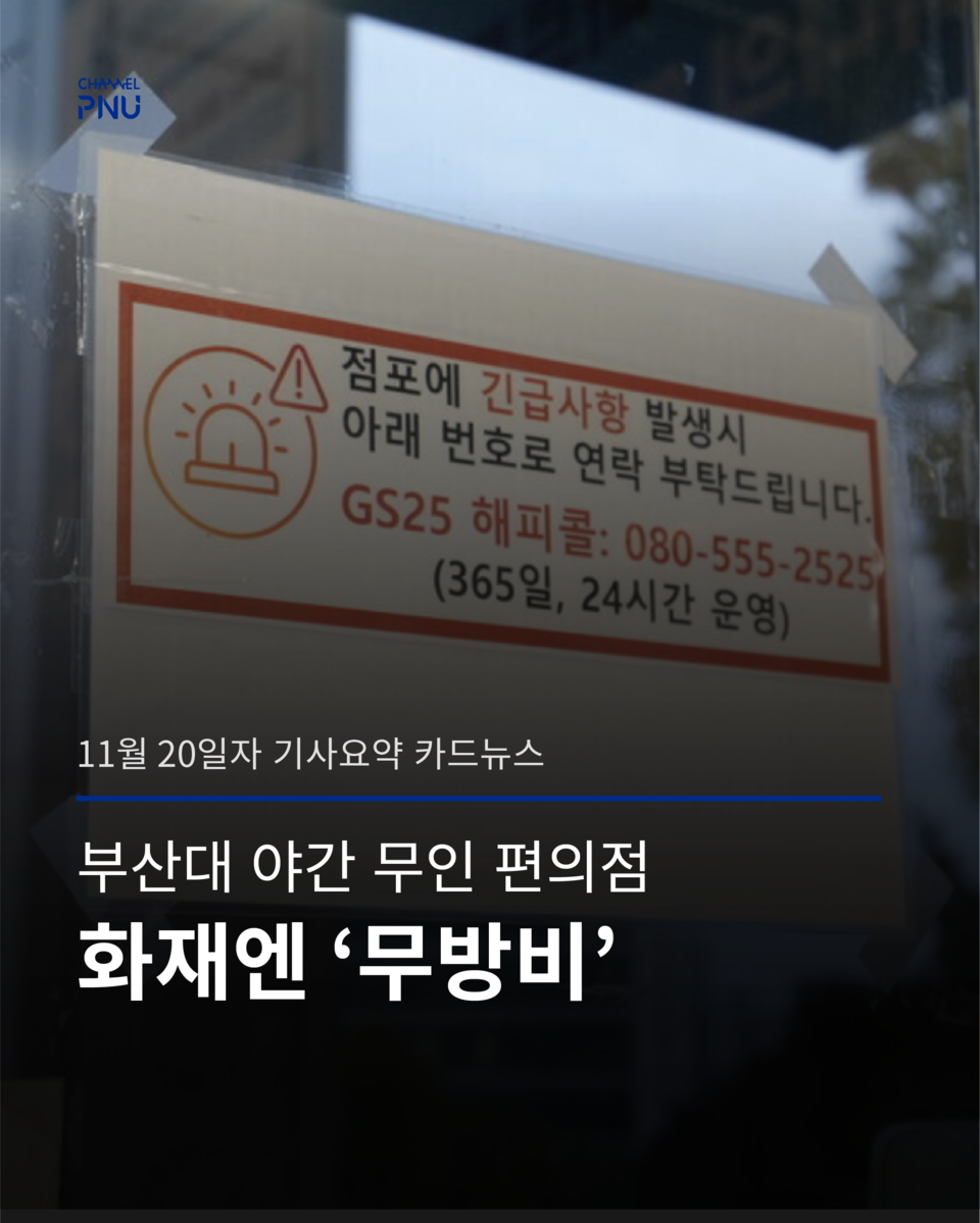 유익해요0공유하고 싶어요0좋아요0화나요0후속기사 원해요0 관련기사 부산대 야간 무인 편의점, 화재엔 '무방비' 박건희 기자 geonhui1224@naver.com 다른기사 보기 저작권자 © 채널PNU 무단전재 및 재배포 금지 당신만 안 본 뉴스 [2026 학생회] 투표 전 필독, 총학 세 후보가 말하는 비전 총학 선본 '온라인 여론 개입' 의혹에 선관위 조사 [2026 학생회] 단과대·동연 후보들 한눈에 보기 [특집] 채널PNU 주최 '총학 후보자와의 만남' 풀영상·전문 공개 총학 선관위원장, 공정성 훼손 논란으로 해임 총학 후보 토론회, 현안 논했지만 구체성은 '글쎄' 부산대 야간 무인 편의점, 화재엔 '무방비' [2026 학생회] 투표 전 필독, 총학 세 후보가 말하는 비전 개의 댓글 회원로그인 작성자 비밀번호 댓글 내용입력 댓글 정렬 최신순 추천순 답글순 BEST댓글 BEST 댓글 답글과 추천수를 합산하여 자동으로 노출됩니다. 닫기 더보기 댓글삭제 삭제한 댓글은 다시 복구할 수 없습니다. 그래도 삭제하시겠습니까? 비밀번호 닫기 댓글수정 댓글 수정은 작성 후 1분내에만 가능합니다. 본문 / 400 비밀번호 닫기 내 댓글 모음 닫기 주요기사 11월 4주 효원알리미 Beyond Borders, Within Growth: PNU Students Share Their Global Stories 총학 후보 토론회, 현안 논했지만 구체성은 '글쎄' Three Candidates Face Off in PNU GSA Election After Nine Years 총학 선관위원장, 공정성 훼손 논란으로 해임 Vacant Houses Reborn as Community Hubs in Busan