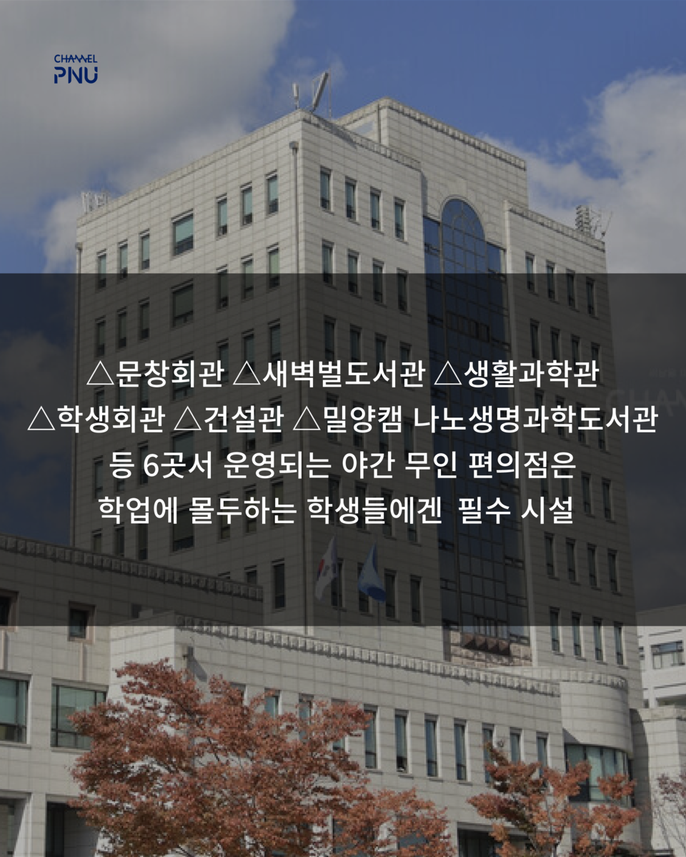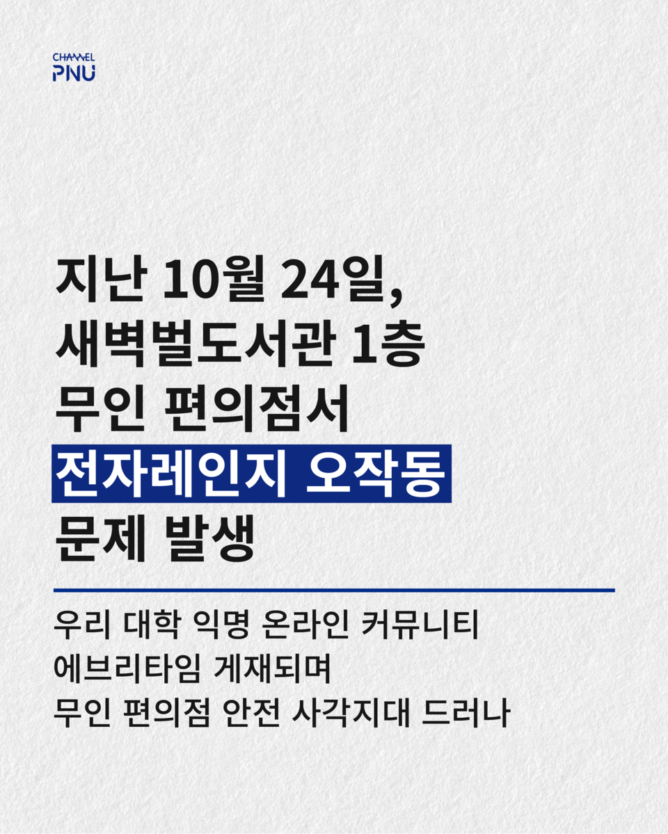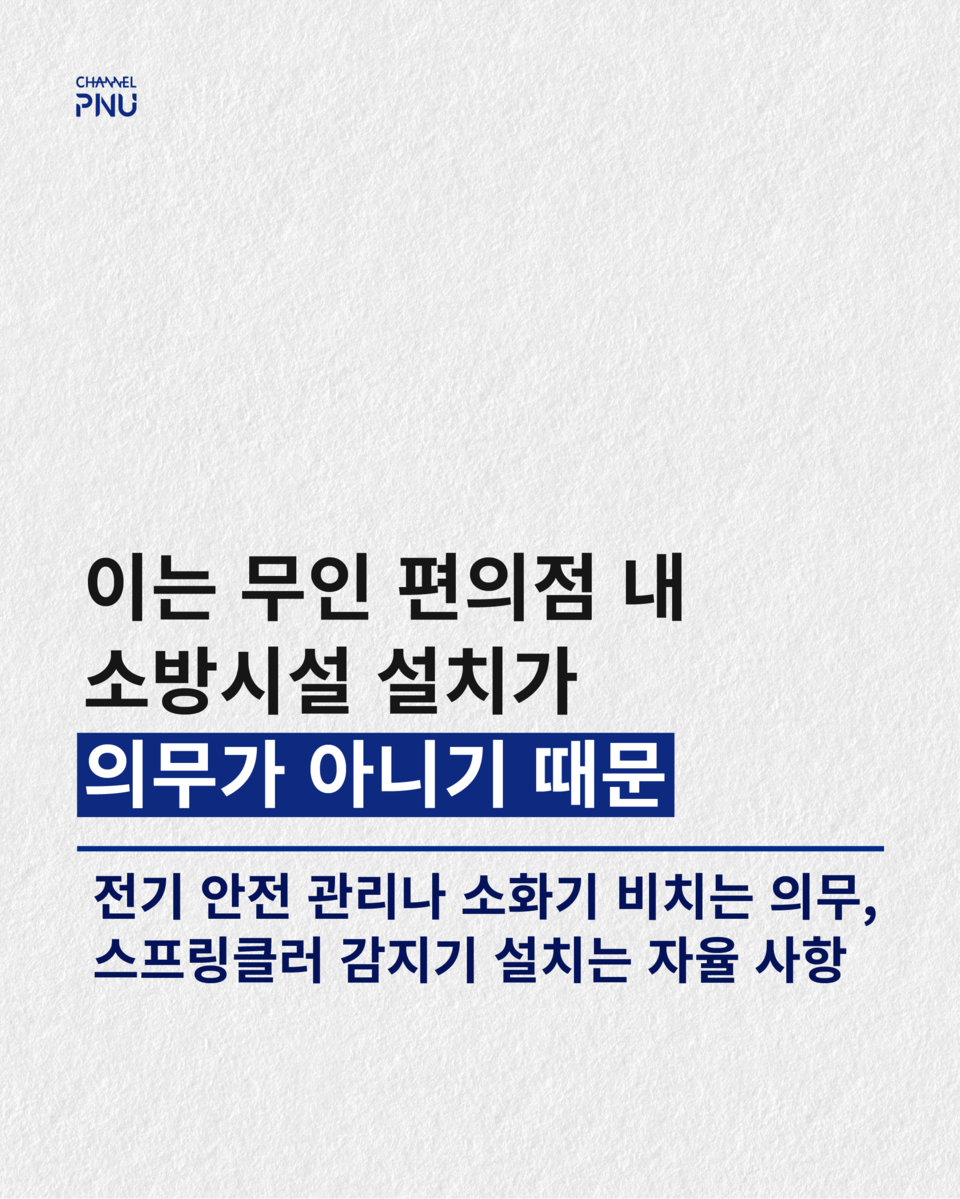 유익해요0공유하고 싶어요0좋아요0화나요0후속기사 원해요0 관련기사 부산대 야간 무인 편의점, 화재엔 '무방비' 박건희 기자 geonhui1224@naver.com 다른기사 보기 저작권자 © 채널PNU 무단전재 및 재배포 금지 당신만 안 본 뉴스 [2026 학생회] 투표 전 필독, 총학 세 후보가 말하는 비전 총학 선본 '온라인 여론 개입' 의혹에 선관위 조사 [2026 학생회] 단과대·동연 후보들 한눈에 보기 [특집] 채널PNU 주최 '총학 후보자와의 만남' 풀영상·전문 공개 총학 선관위원장, 공정성 훼손 논란으로 해임 총학 후보 토론회, 현안 논했지만 구체성은 '글쎄' 부산대 야간 무인 편의점, 화재엔 '무방비' [2026 학생회] 투표 전 필독, 총학 세 후보가 말하는 비전 개의 댓글 회원로그인 작성자 비밀번호 댓글 내용입력 댓글 정렬 최신순 추천순 답글순 BEST댓글 BEST 댓글 답글과 추천수를 합산하여 자동으로 노출됩니다. 닫기 더보기 댓글삭제 삭제한 댓글은 다시 복구할 수 없습니다. 그래도 삭제하시겠습니까? 비밀번호 닫기 댓글수정 댓글 수정은 작성 후 1분내에만 가능합니다. 본문 / 400 비밀번호 닫기 내 댓글 모음 닫기 주요기사 11월 4주 효원알리미 Beyond Borders, Within Growth: PNU Students Share Their Global Stories 총학 후보 토론회, 현안 논했지만 구체성은 '글쎄' Three Candidates Face Off in PNU GSA Election After Nine Years 총학 선관위원장, 공정성 훼손 논란으로 해임 Vacant Houses Reborn as Community Hubs in Busan